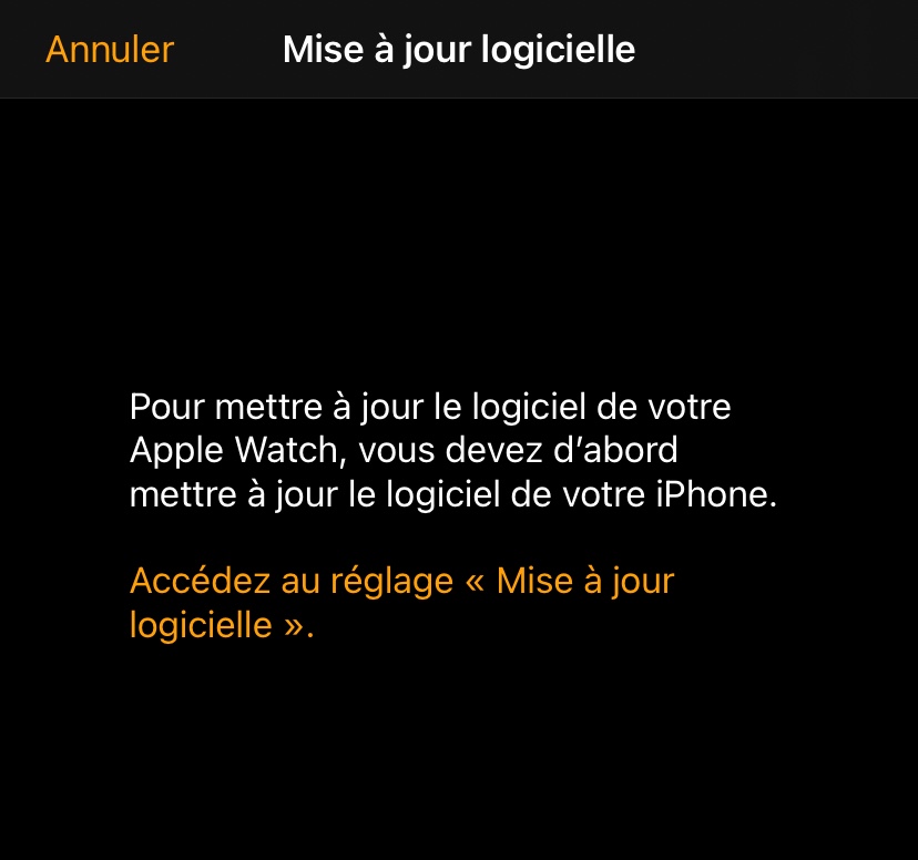 j’ai essayé d’éteindre et redémarrer la watch et le tel mais rien n’y fait. À chaque fois que je tente le jumelage il me renvoie vers la page de Mise à Jour de l’iPhone… (photo)
