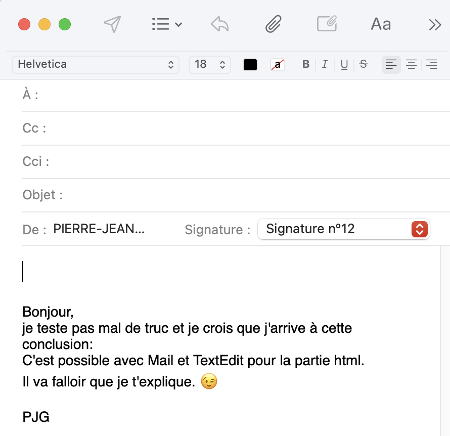 Ma question est la suivante: comment intégrer une signature électronique à la fin de mes mails étant donnée que c'est une signature html? J'ai un fichier html avec le code de ma signature (avec mes coordonnées, une photo, etc...) et cette dernière fonctionne sur Gmail, Mozilla Thunderbird etc... mais impossible de l'intégrer sur  Mail.