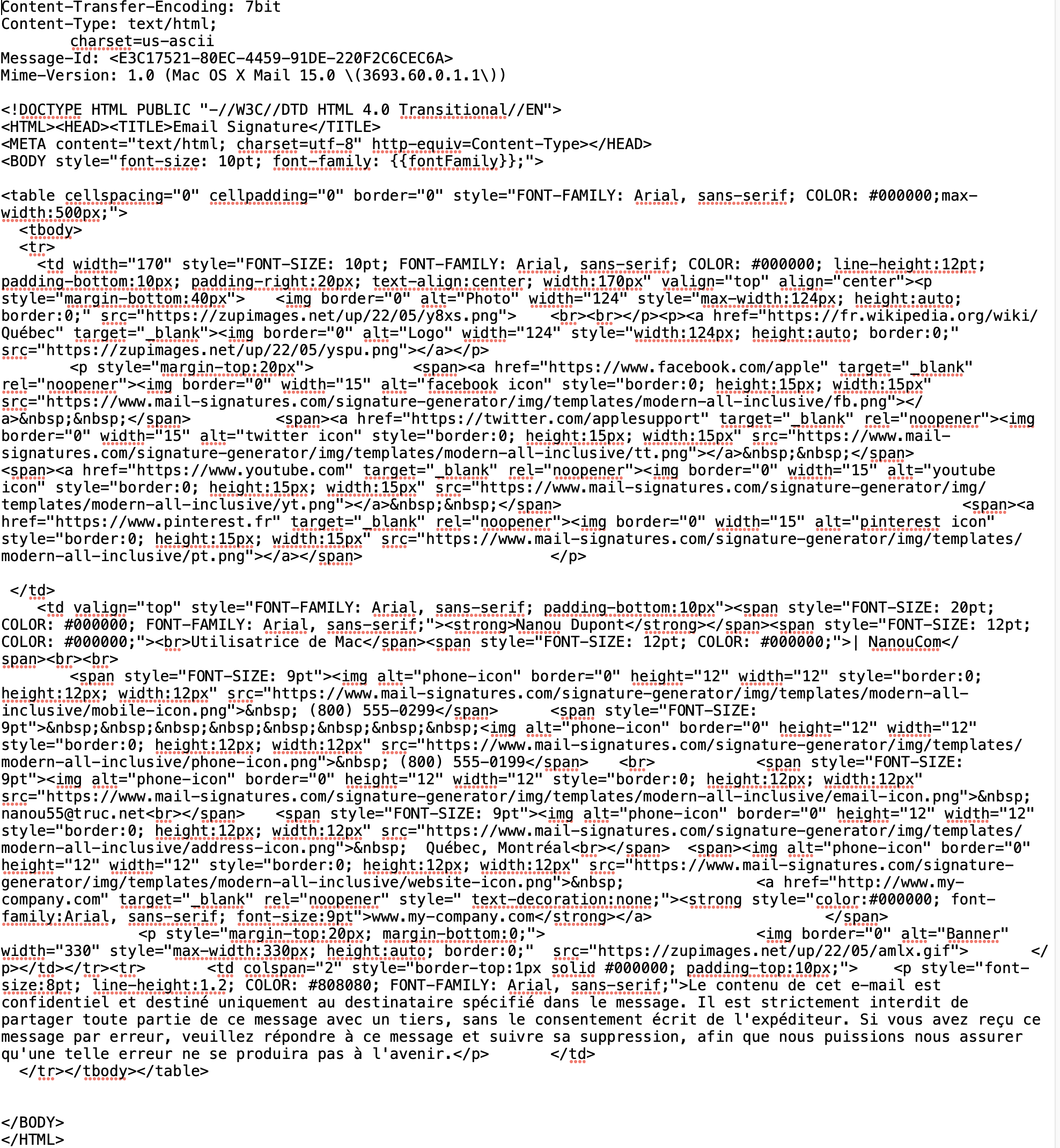 Ma question est la suivante: comment intégrer une signature électronique à la fin de mes mails étant donnée que c'est une signature html? J'ai un fichier html avec le code de ma signature (avec mes coordonnées, une photo, etc...) et cette dernière fonctionne sur Gmail, Mozilla Thunderbird etc... mais impossible de l'intégrer sur  Mail.