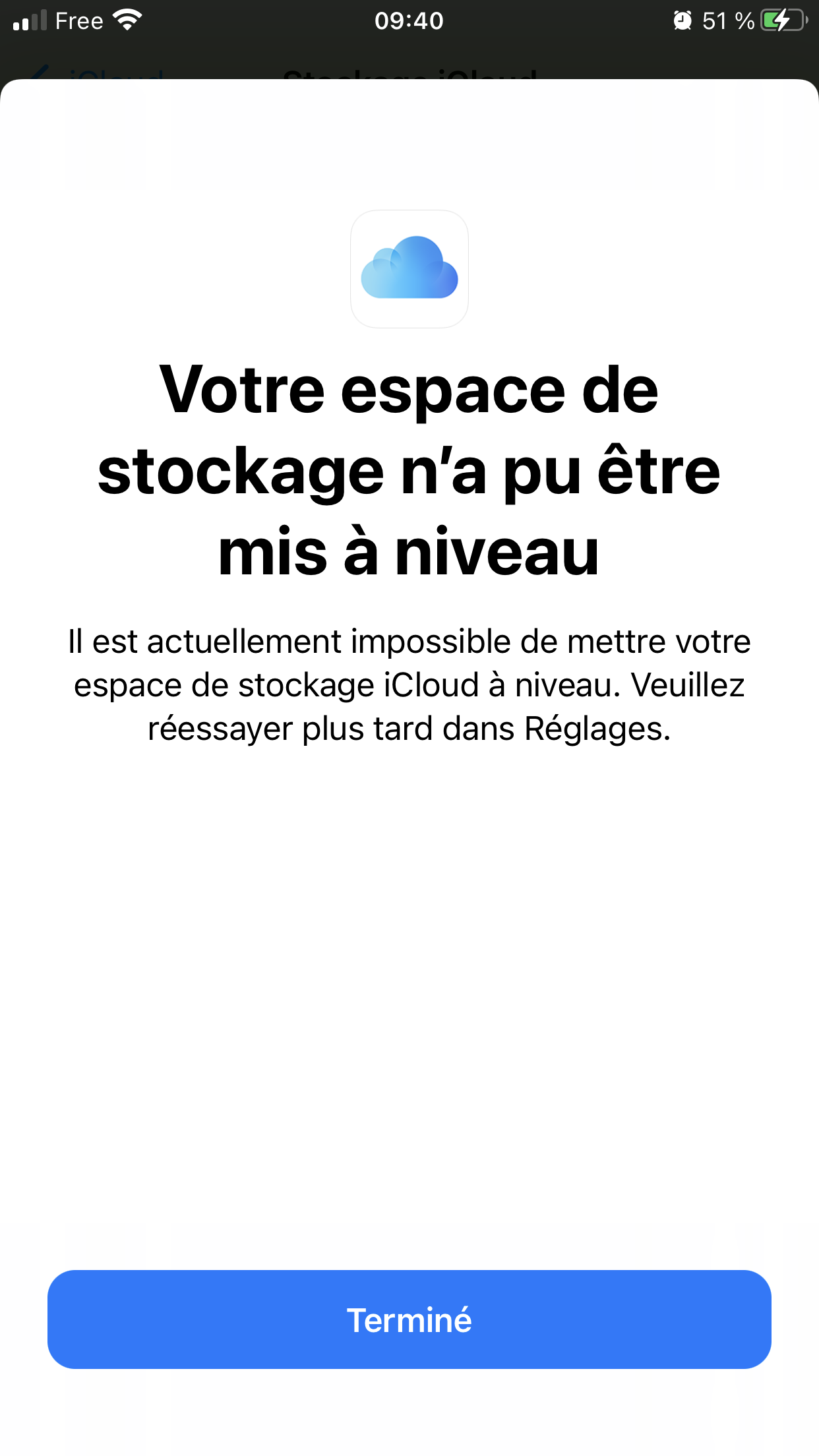 Bonjour, depuis hier j’essaye d’augmenter mon niveau de stockage iCloud mais ça ne fonctionne pas. J’ai ce message qui apparaît (voir photo). Comment faire? Je n’ai pas de PC.