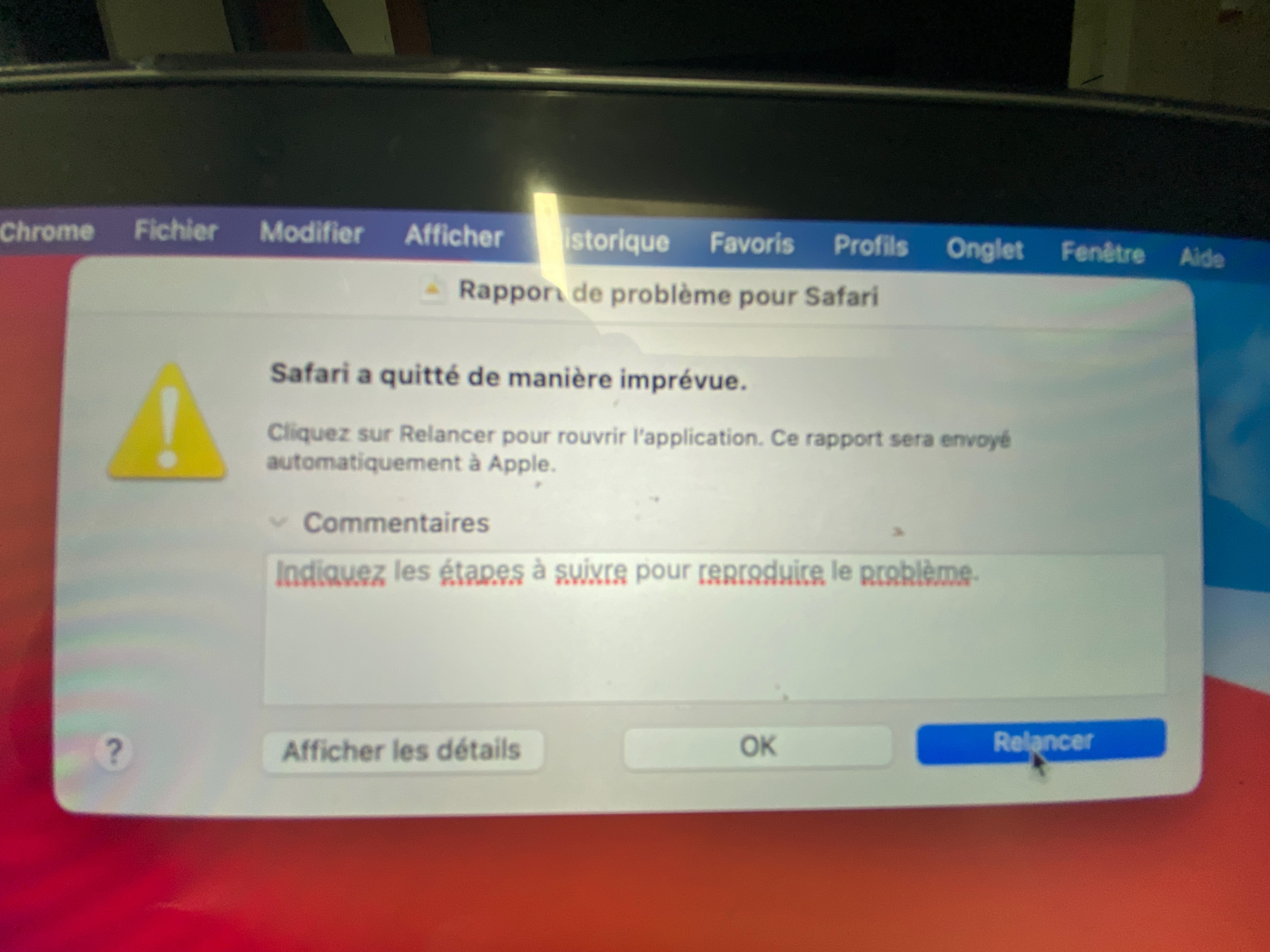 Cela affiche Safari a quitté de manière quand je l’ouvre. Et si je clic sur relancer rien marche
