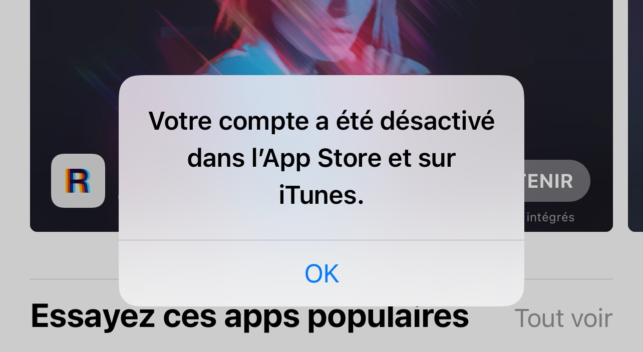 Lorsque je m’apprête à installer ou mettre à jour une application, s’affiche “Votre compte a été désactivé dans l’app store et iTunes”, que faire svp?