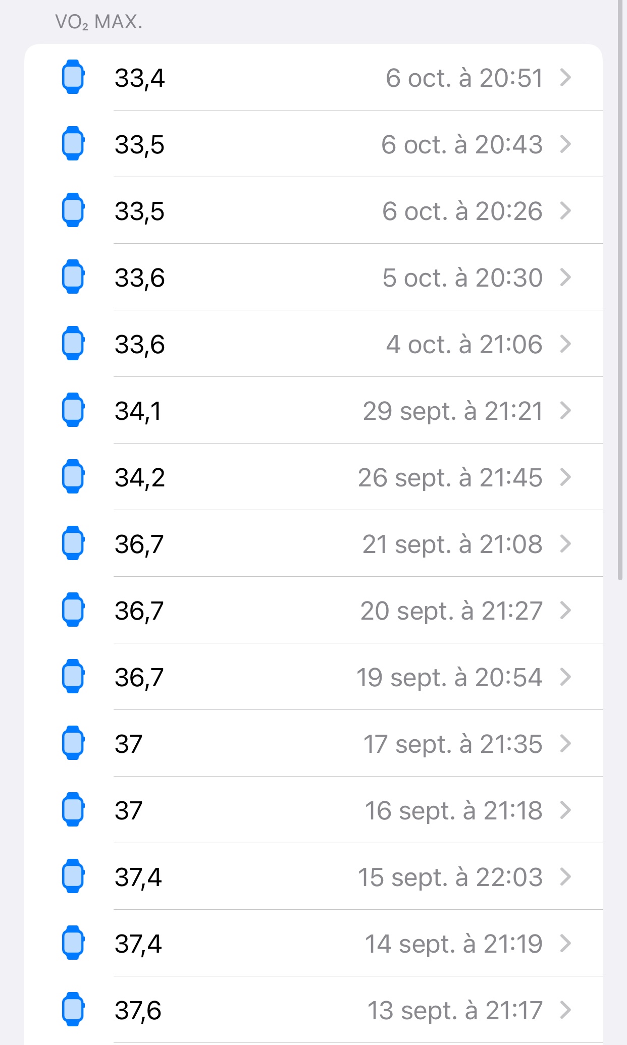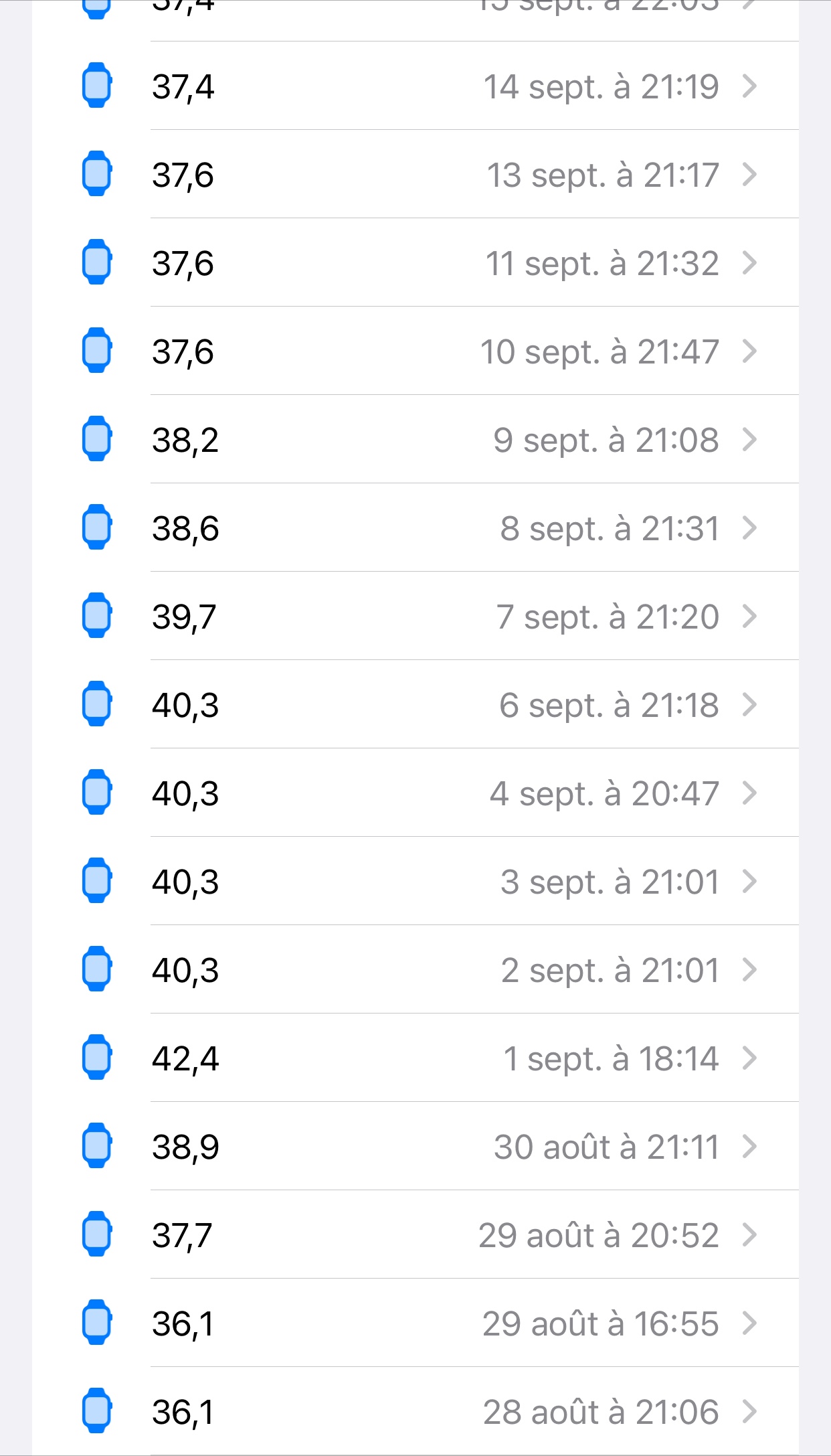 je ne suis pas très sportif, cependant en fin d’août j’ai commencé à faire du footing tous les soirs et Apple Watch a commencé donc de mesurer la VO2 Max. Tout d’abord j’étais à 36.1, ça a commencé à grimper et quelques jours plus tard j’étais déjà 42,4.