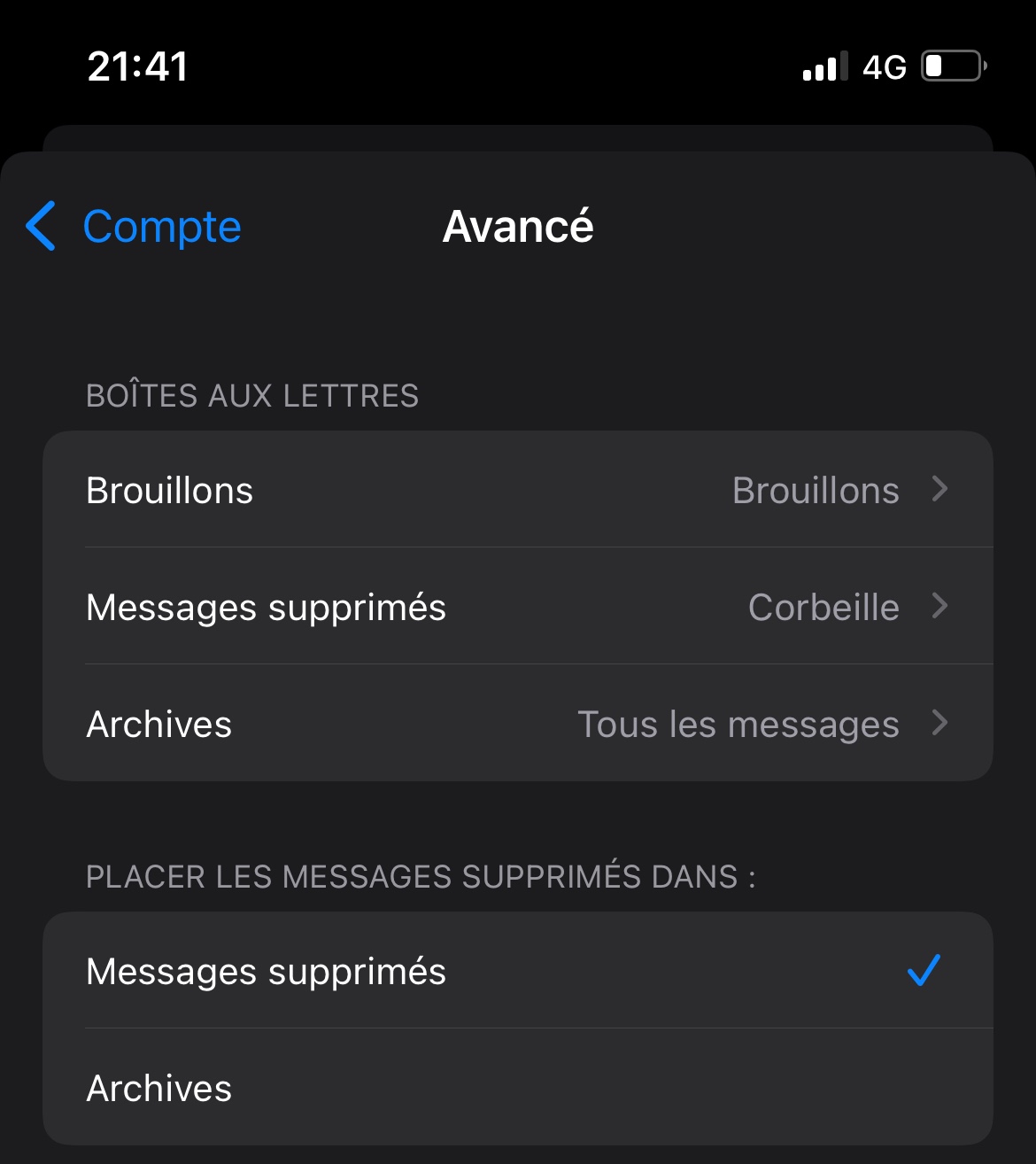 il faut aller dans réglages / mail / comptes / choisir votre compte ensuite appuyer sur votre adresse mail / avancé / et enfin vous pouvez choisir archiver ou supprimer.