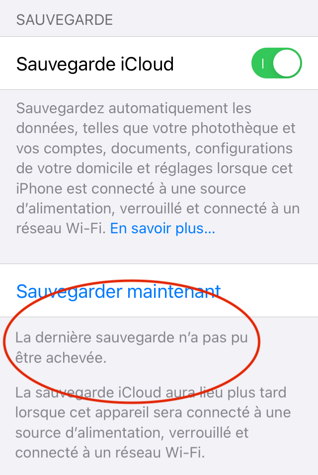 Après chaque tentative de sauvegarde, je reçois le message : «La dernière sauvegarde n'a pu être achevée.»