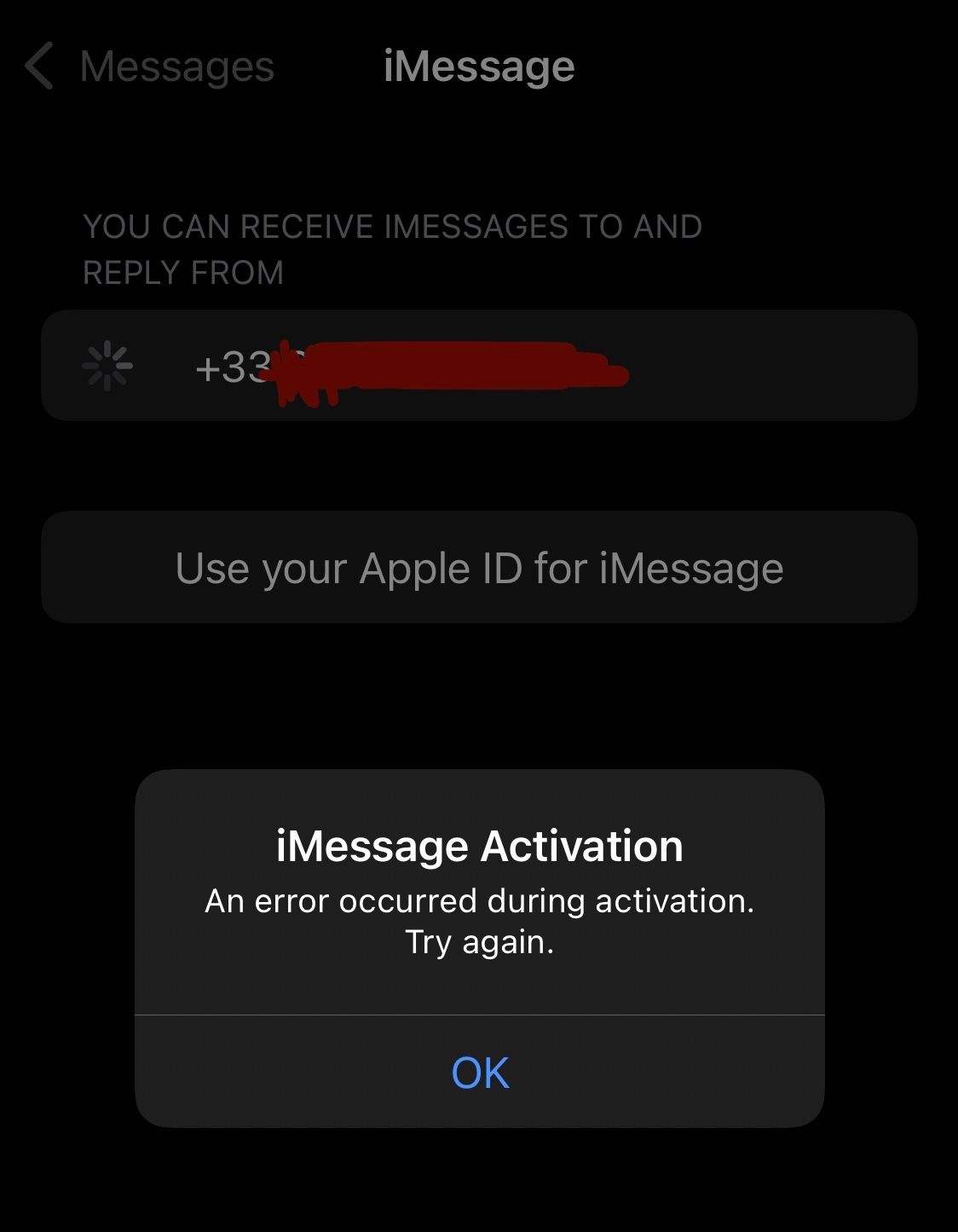 As-tu le même message d'erreur quand tu essayes d'activer iMessage avec ton identifiant apple en cliquant sur "Use your Apple ID" ?