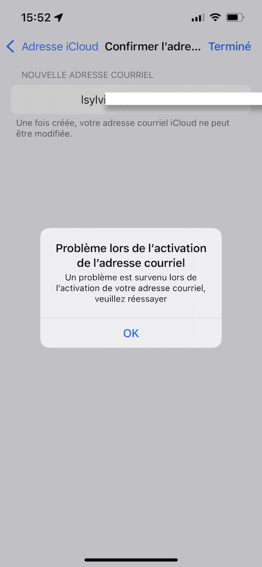 Dans ce cas, vérifiez votre connexion, essayez de redémarrer votre iPhone et de recommencer, et assurez vous que cette adresse n'est pas déjà existante (une message vous prévient si c'est le cas). Vous devrez ensuite confirmer via un mail de confirmation qui sera envoyé sur votre identifiant Apple.