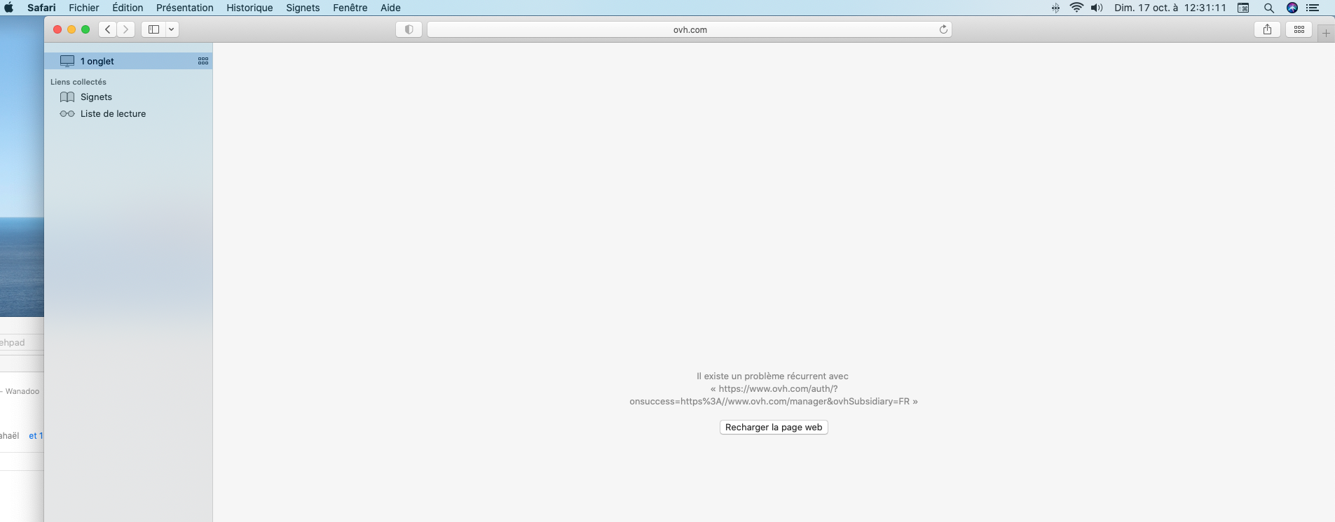 Utilisateur de Safari sur mon iMac depuis quelques temps je ne peux accéder à mon compte OVH. Une fenêtre popup m'indiquant qu'il existe un problème récurent avec une ligne de code.