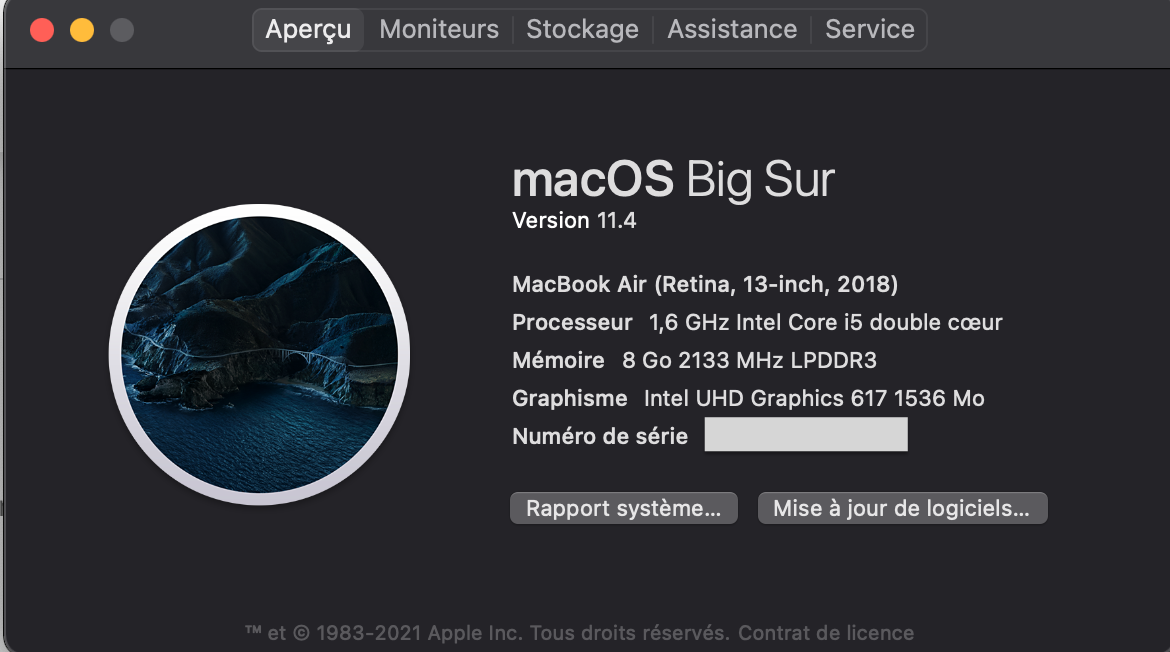 Impossible de télécharger la mise à jour, erreur réseau au bout de quelques Mo. Essai en mode sans échec, échec aussi. Pourtant j'ai une connexion fibre. Ce n'est pas la première fois, je n'ai jamais pu mettre à jour Big Sur.