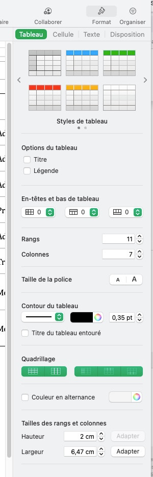 Mais dans ma version version 11.2 de Numbers, la barre latérale Format me propose 4 choix (Tableau, Cellule, Texte et Disposition), mais pas Document.