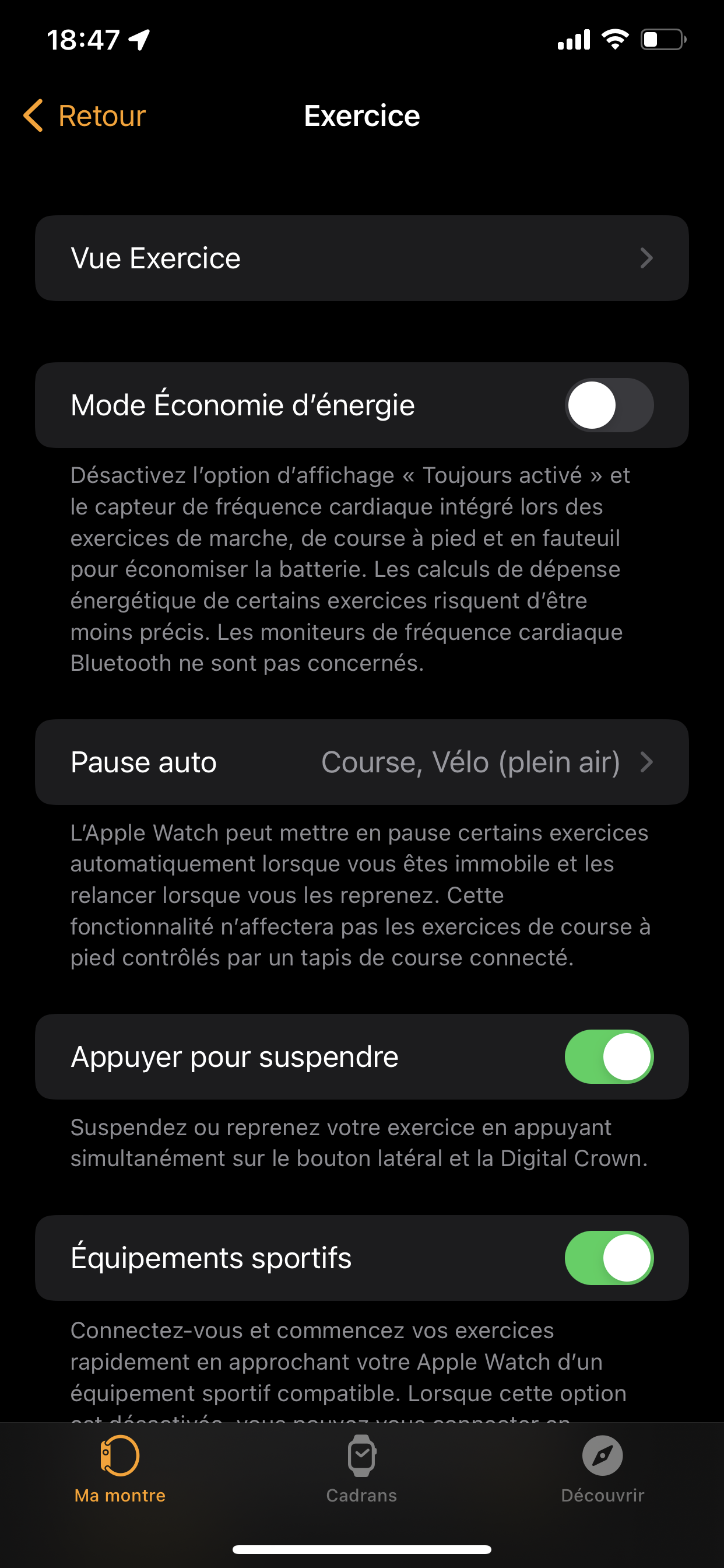 Comment faire la sélection rappel de début dexercice en apple watch 6 os 8.1. jai pas trouve loption en réglages exercise ??