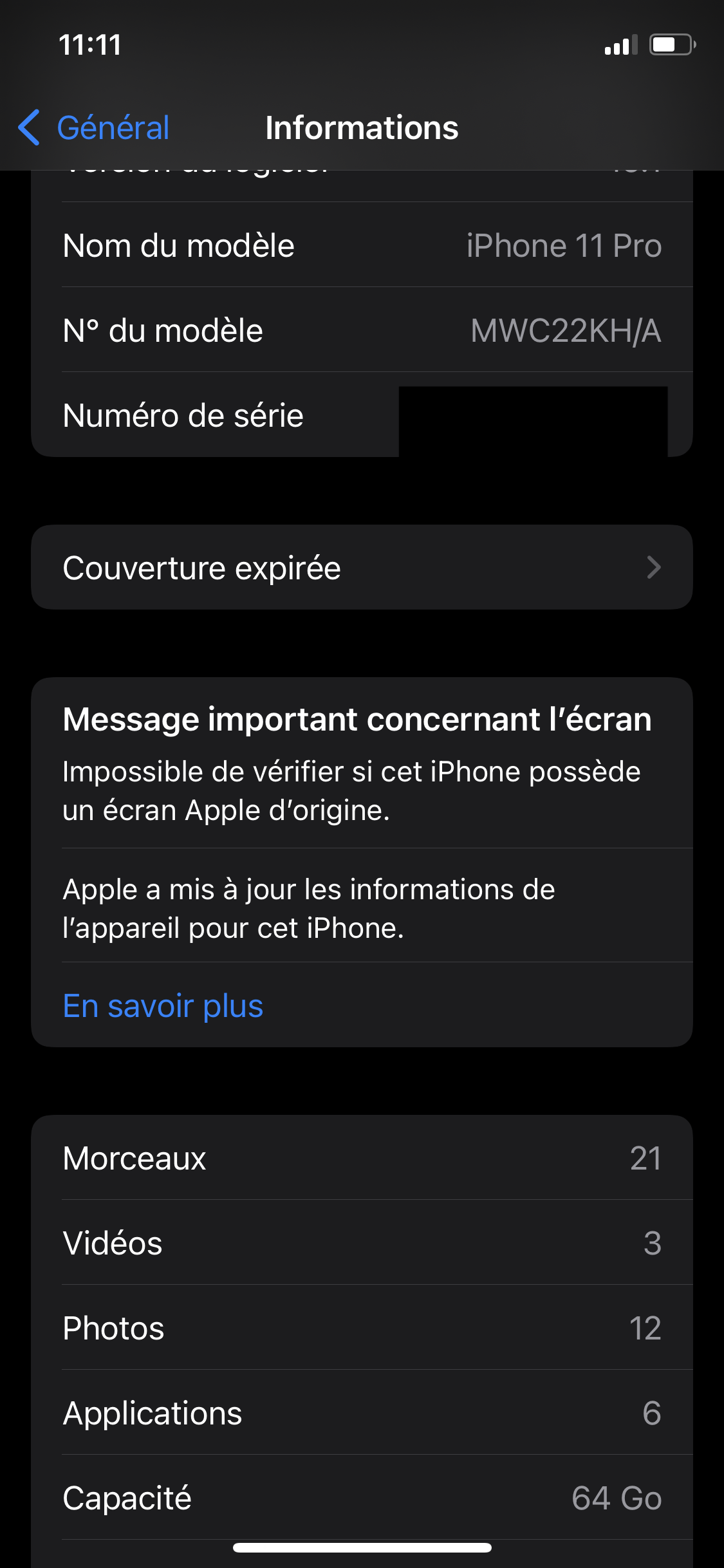 Si vous avez des doutes sur l'authenticité de votre écran d'iPhone 11 Pro, il existe de multiples façons d'avoir des informations sur votre écran, et encore plus avec les iPhone récents qui vous affichent déjà un message d'erreur s'il n'arrive pas a récupérer les informations de l'écran.