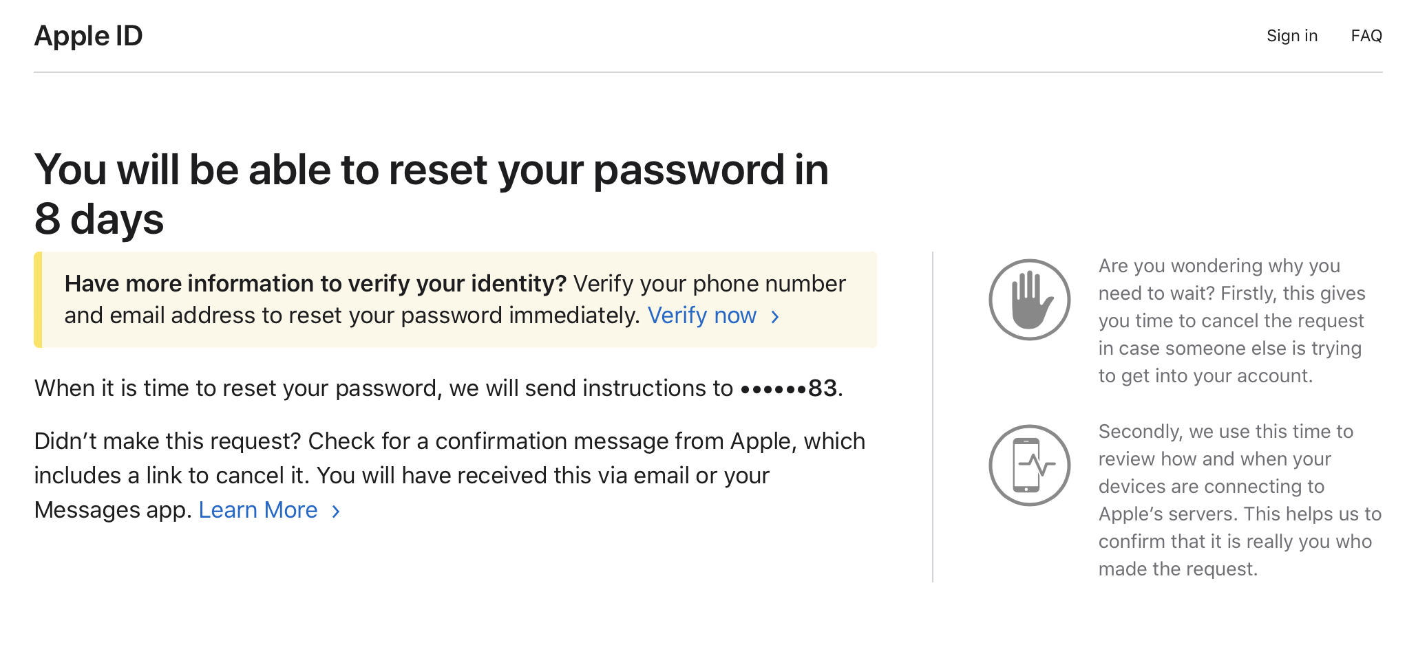 Si vous avez déjà effectué la procédure de récupération de compte, un délai est en effet en place avant que vous puissiez récupérer votre compte. Il s'agit d'une sécurité évitant à quelqu'un de mal attentionné de chercher à avoir accès à un Identifiant Apple.