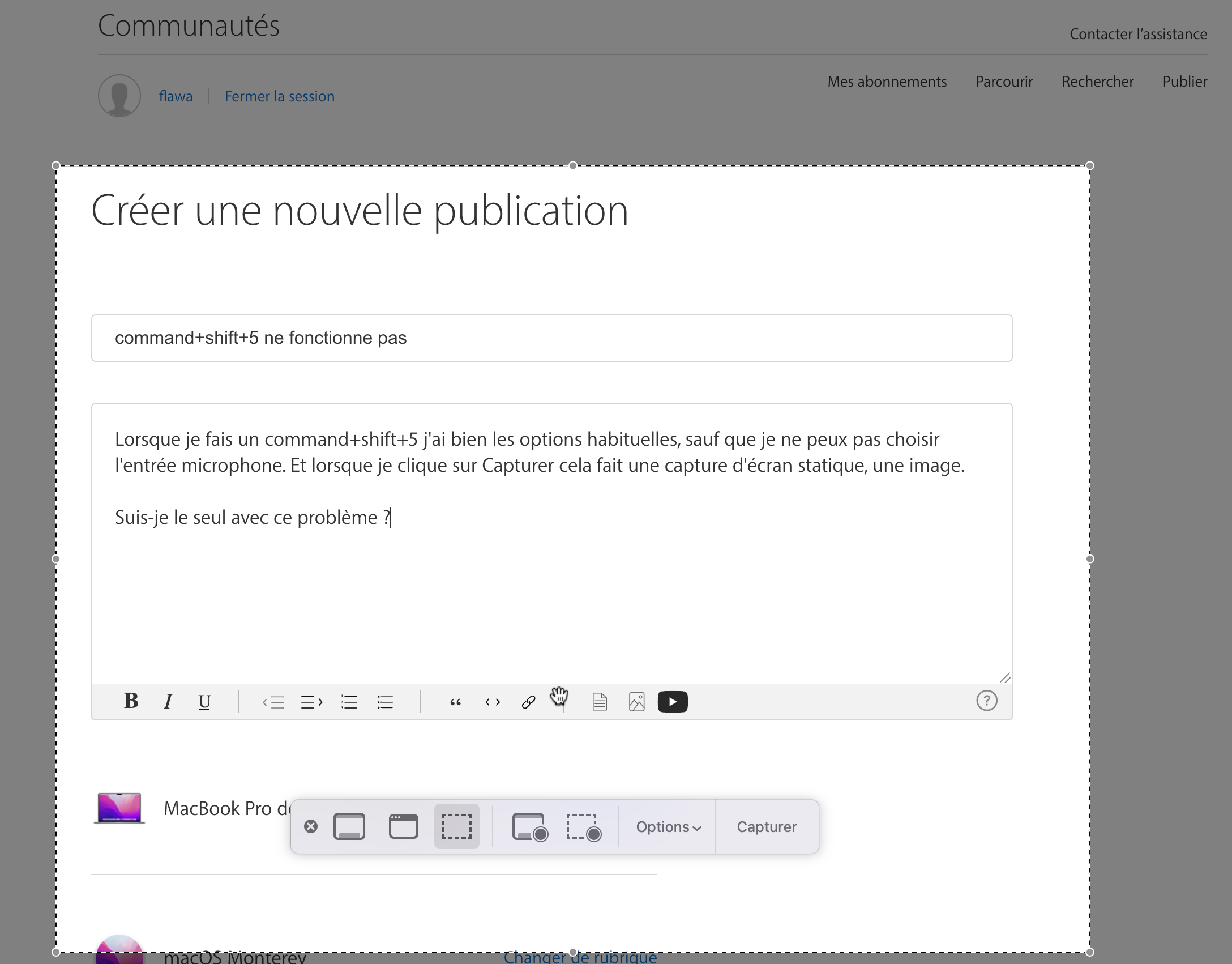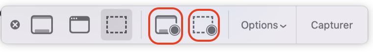 Lorsque je fais un command+shift+5 j'ai bien les options habituelles, sauf que je ne peux pas choisir l'entrée microphone. Et lorsque je clique sur Capturer cela fait une capture d'écran statique, une image.