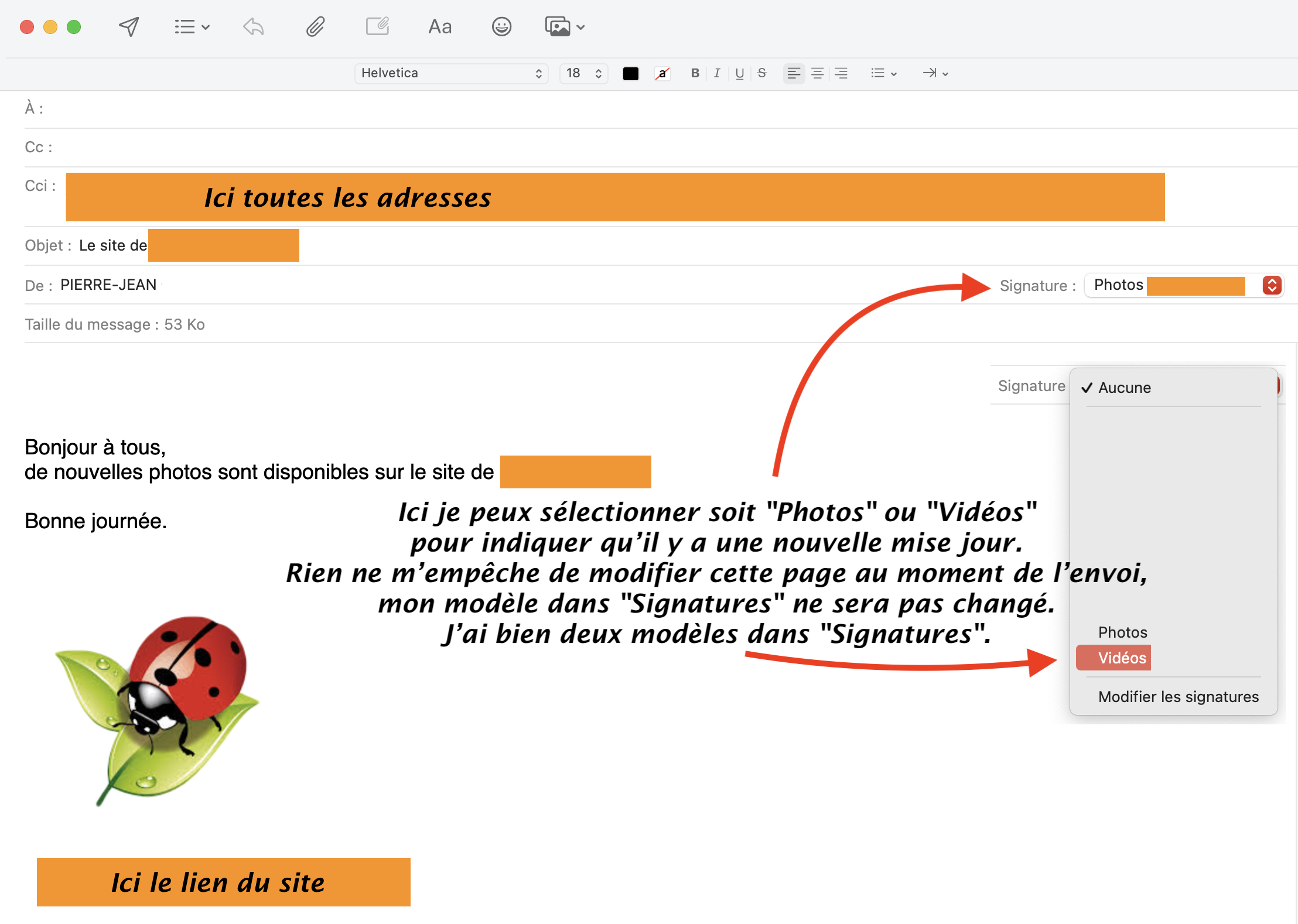 J'utilise "Signatures" depuis Mail pour envoyer toujours le même message à plusieurs personnes.