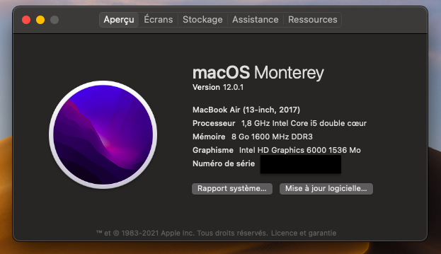 Quel est le modèle exact ? Quelle version macOS ?, Quelle année ? Quel espace sur ton disque interne ? Tu peux obtenir les infos dans la pomme : > À propos de ce Mac. > Aperçu et > Stockage