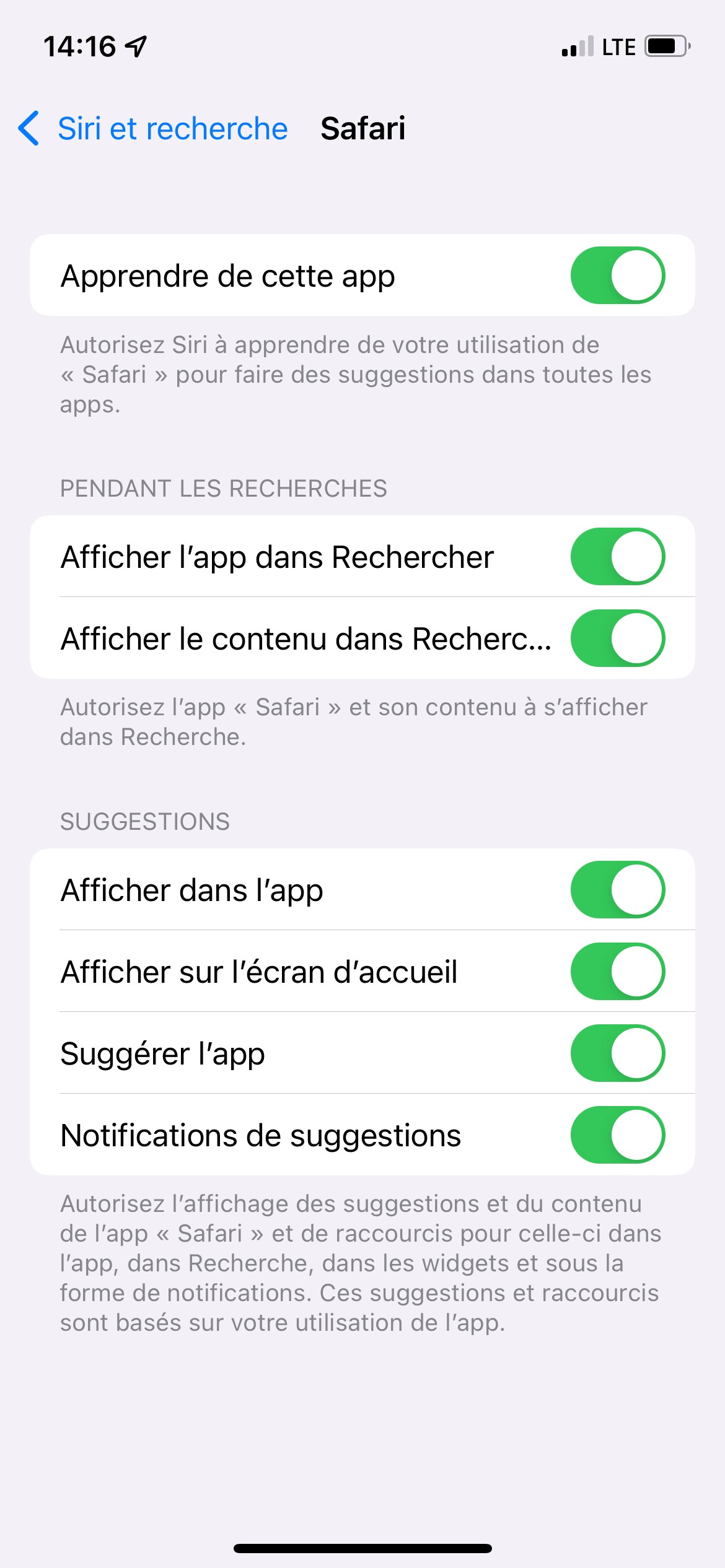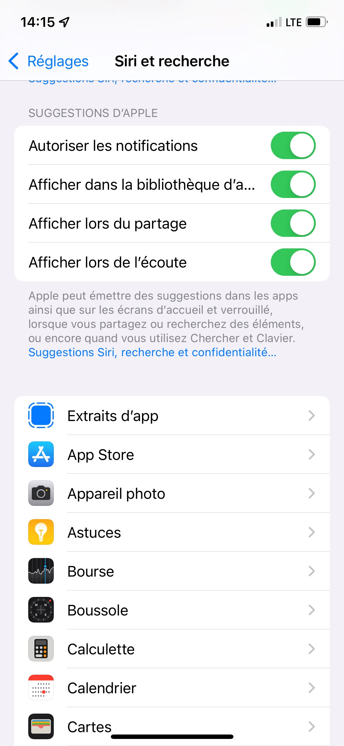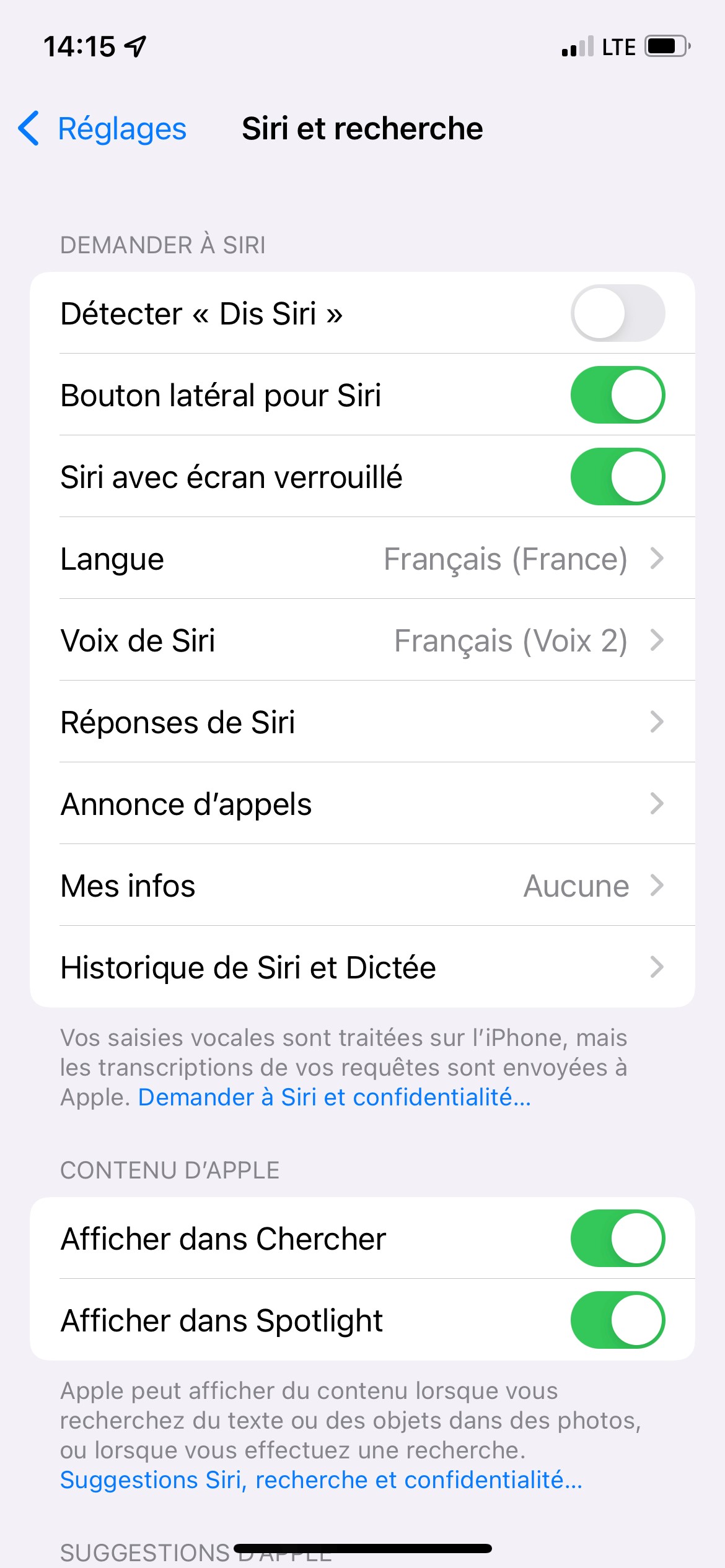 Les recherches Spotlight sont liées à Siri, donc vérifie également au niveau des réglages Siri pour t'assurer qu'ils soient corrects. L'article Utilisation de la fonction de recherche sur un iPhone, iPad ou iPod touch donne plus d'infos à ce sujet.