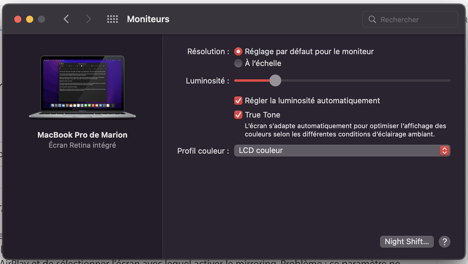 J'ai récemment acheté un MacBook Pro 2020 13" (actuellement sur Monterey mais ça ne fonctionnait pas non plus sur Big Sur) et je souhaitais l'utiliser avec mon iPad Pro 2017 grâce à AirPlay. Après plusieurs recherches, je vois qu'il y a normalement un paramètre dans les écrans qui permet de cocher AirPlay et de sélectionner l'écran avec lequel activer le mirroring.