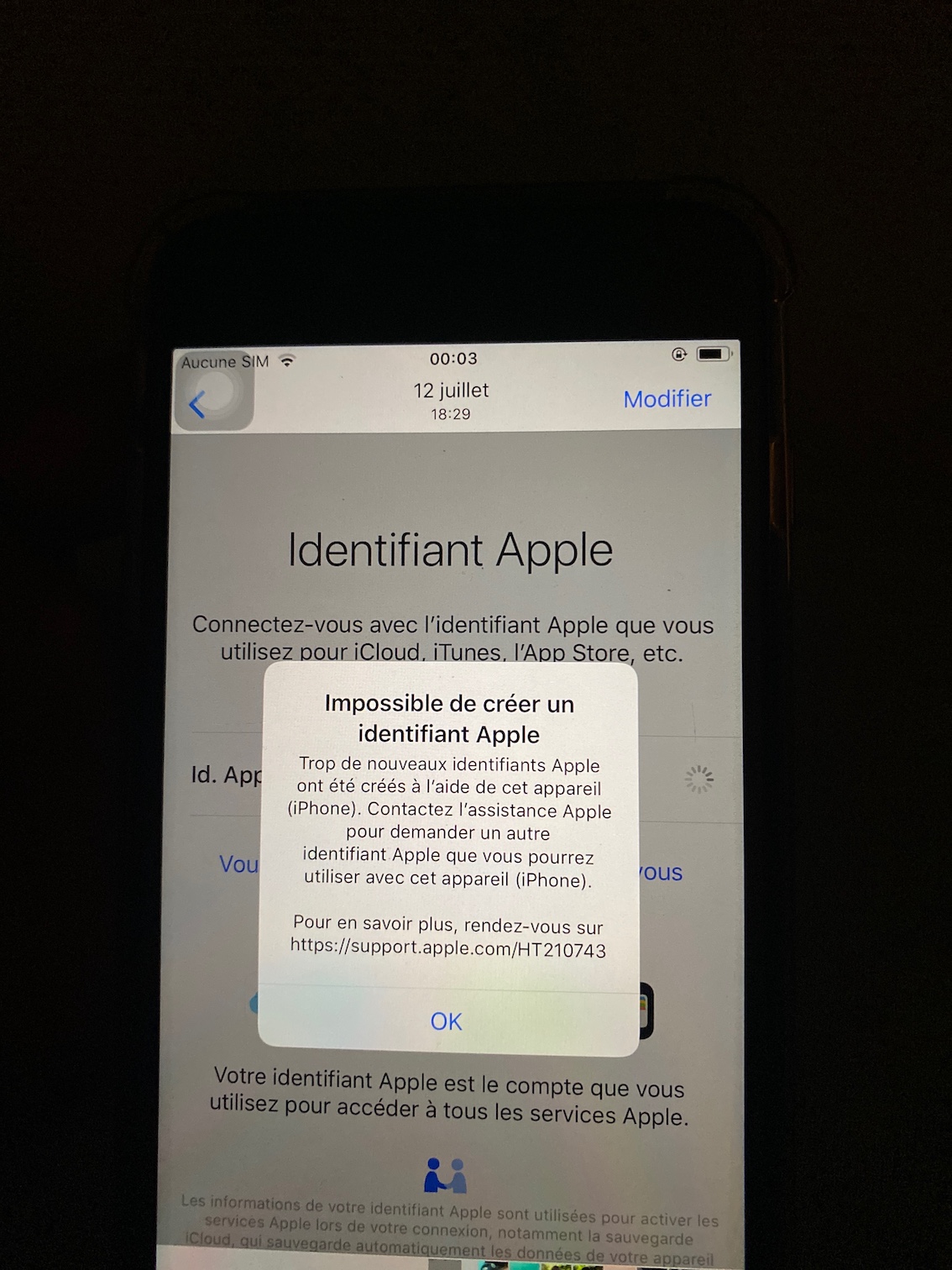 Si c'est bien ce que tu fais, il semblerait que quelque chose bloque la possibilité de mettre ton compte. As-tu vérifié le document Si le message « Impossible de créer l’identifiant Apple » ou « Impossible de configurer iCloud » s’affiche comme indiqué dans le message que tu reçois ? Si tu n'as pas encore eu l'occasion de le faire, n'hésite pas à y jeter un œil car il donne pas mal d'infos.