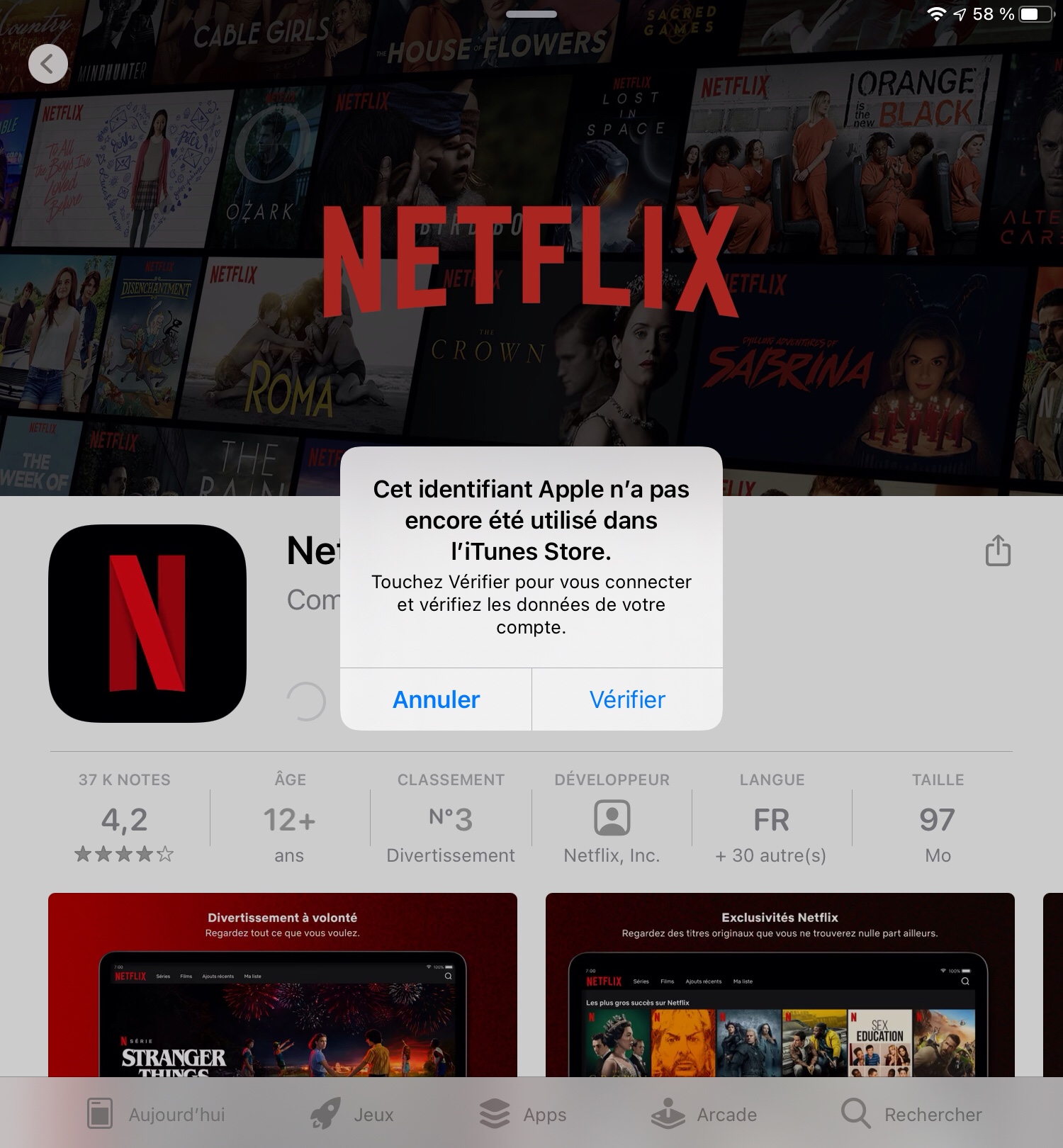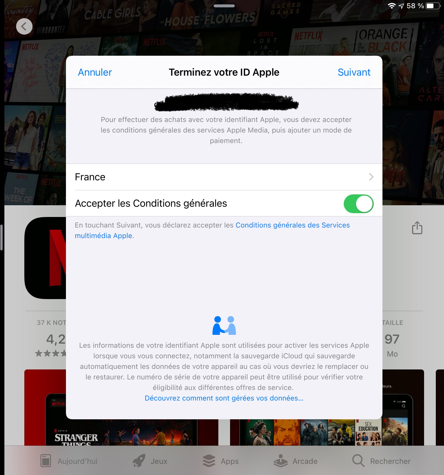 Lorsque j’essaye de télécharger une application dans l’app Store, une rubrique apparaît me disant que mon identifiant Apple n’a pas encore été utilisé dans l’iTunes Store et de toucher *vérifier* pour me connecter et vérifier les données de mon compte. On me demande alors, après que j’ai accepté les conditions d’utilisation, de terminer mon ID Apple (Mode de paiement, nom de facturation, adresse de facturation). Une fois que j’ai rempli toutes ces informations, on me demande de contactez l’assistance iTunes pour finaliser la transaction.