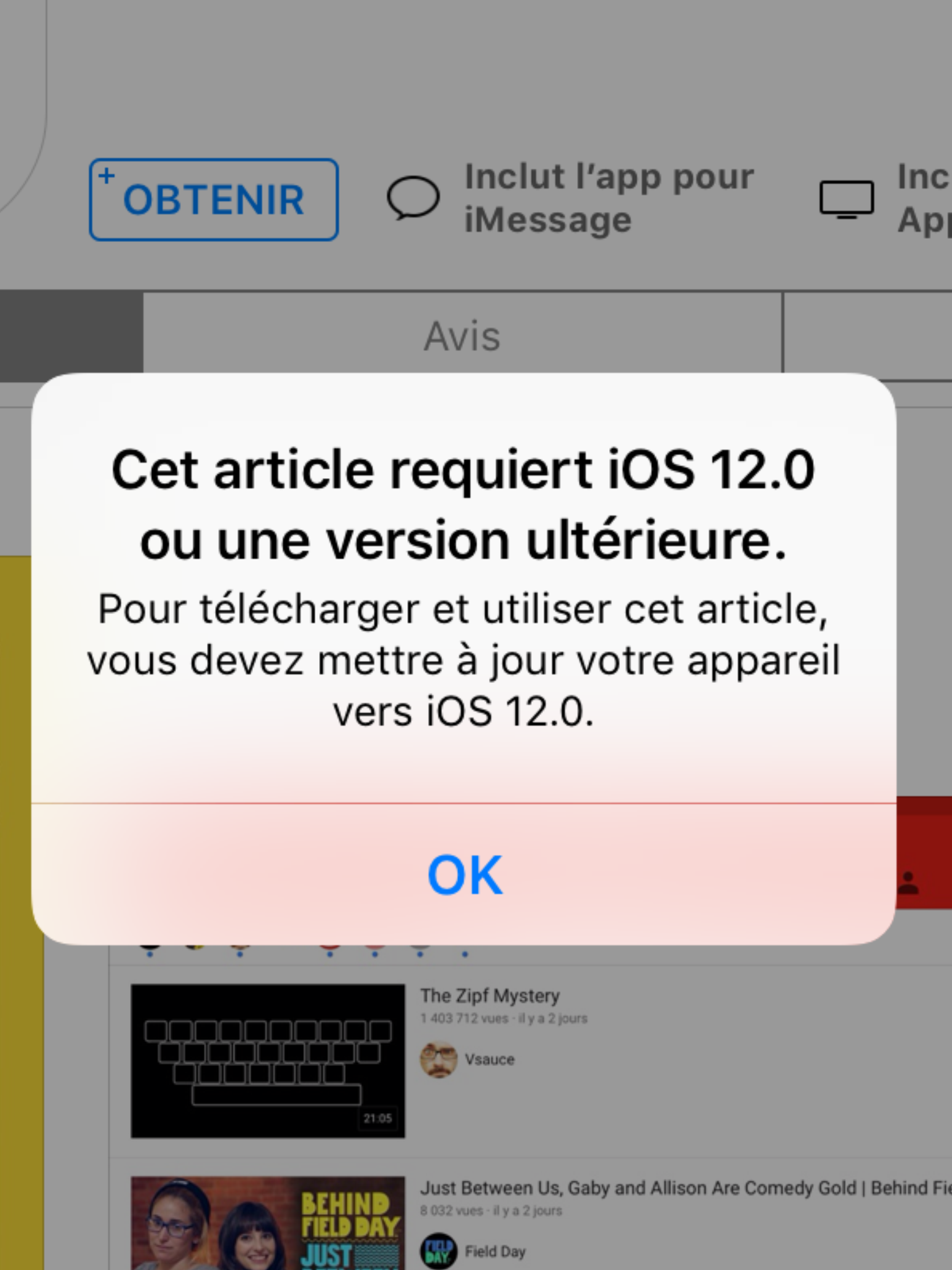 Bonjour, quand je veux télécharger des applications (j'ai essayer de télécharger YouTube sa ne marche pas sa me demande la version 12 mais quand j'ai essayer de mettre Tiktok cela a marcher) sur mon IPad cela me demande d'avoir la version IOS12 ou la 11 (je suis sur la 10.3.3) mais dans mes paramètres cela me dis que je suis à jour.Aidez moi s'il vous plaît 😔