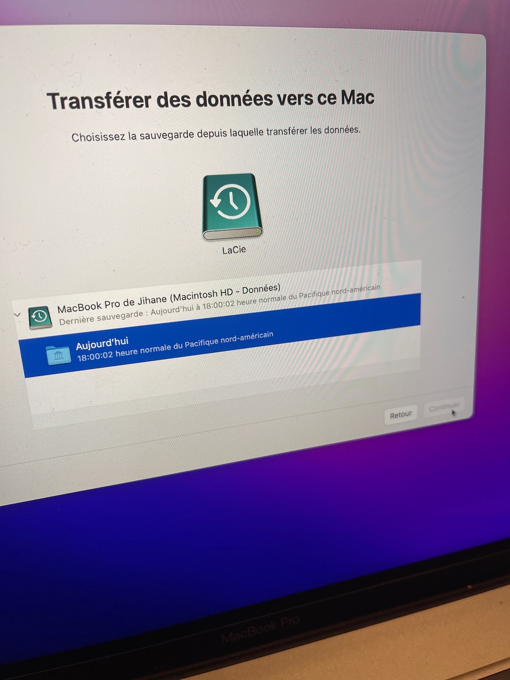 via Time Machine, je sélectionne la sauvegarde je clique sur continue et rime ne se passe, je peut cliquer sur retour ou sur le DDE, mais quand je continue ça grise juste le bouton “continuer”, j’ai essayé de patienter mais ça fait 3heures… j’ai relancé 3 fois le Mac, rien n’y fait….problème transfert de données
