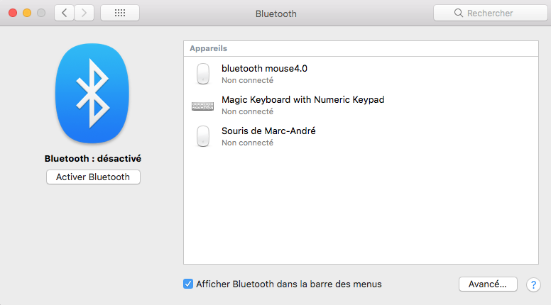 Mon clavier bluetooth alu et ma souris 4.0 fonctionnent parfaitement en bluetooth bien que celui ci ne soit pas actif et l'icone absente du menu supérieur de mon Imac. La led verte de la touche Maj n'indique plus si je suis en Maj ou en Min ce qui est très gênant . Auriez vous une solution pour réinitialiser cela ?