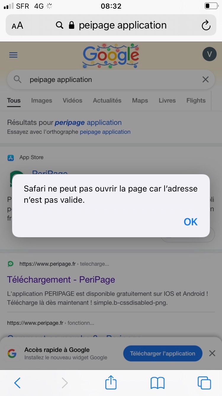 je souhaite télécharger une application sur le téléphone de ma fille de (application PeriPage pour impression de photo, cadeau de noël ) mais je n’y à arrive pas . Cela me notifie adresse invalide ? D ailleurs il n’y a pas l icône À sur l iPhone de ma fille . Avec le partage familial et le contrôle appliqué sur le téléphone il faut peut être que je désactive quelque chose ?