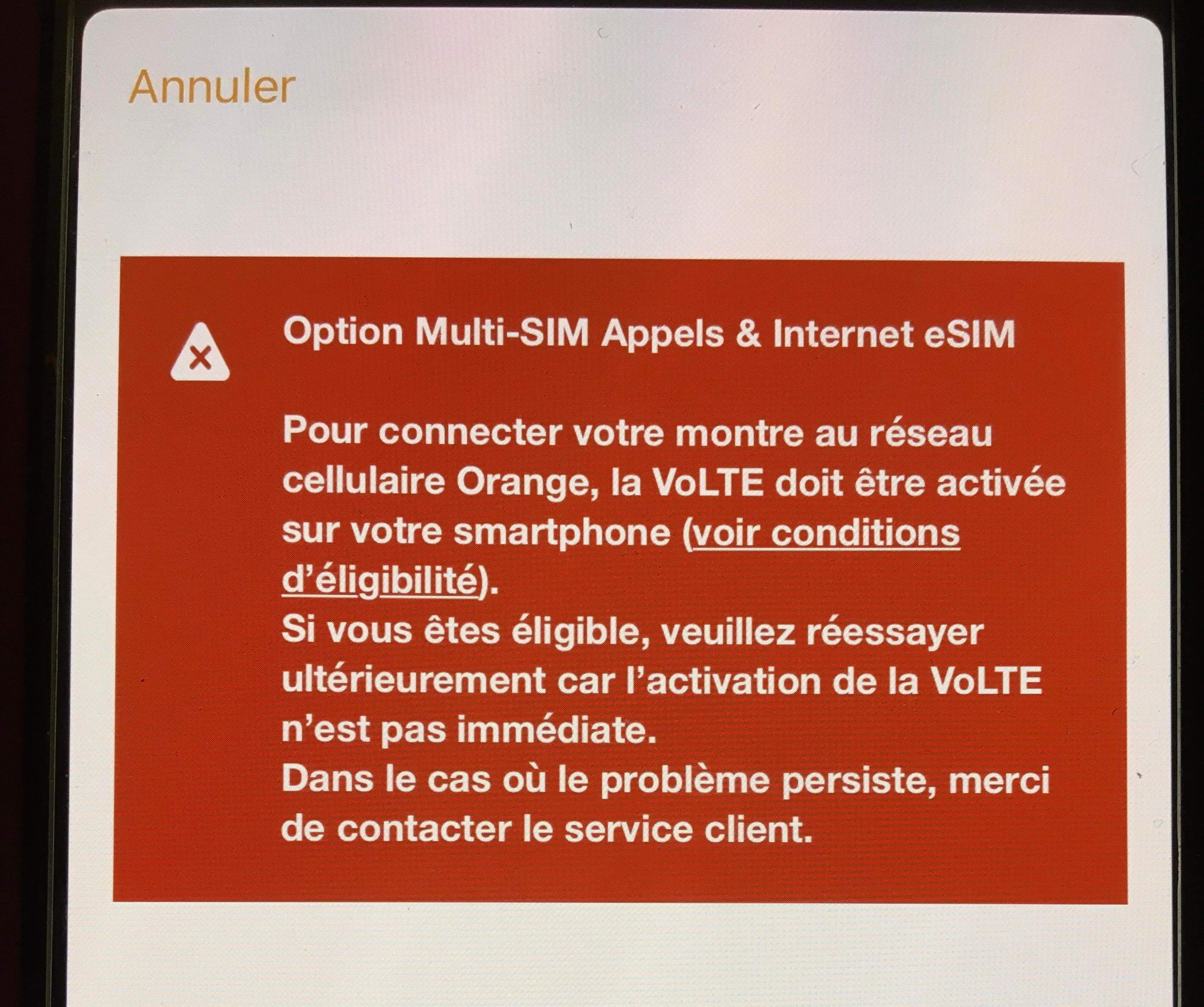 j’ai offert une apple watch cellulaire a ma compagne depuis 2 semaines depuis impossible d’activé un forfait cellulaire , on as bien activé la voLTE et le voWIFI depuis 5 jours mais le problème persiste toujours en essayant d’activer ce forfait on tombe sur ce message d’erreur, on ne sait plus comment faire après avoir été chez orange on nous dit c’est normal la voLTE met un peu de temps a s’activé mais on peux vérifier en appelant si elle est bien activé et on voit bien que c’est ok , quand on appelle orange on nous dit de faire avec le téléphone ou de contacté apple , est ce que quelqu’un a déjà rencontré ce problème on as aussi réinitialiser la montre mais rien n’y fait