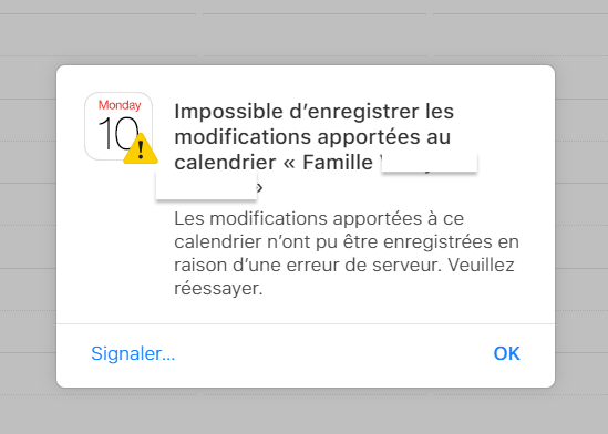 Sur le calendrier de mon compte iCloud.com, j'ai régulièrement une erreur "serveur" avec des messages "ERROR Server error" et je ne comprends pas pourquoi...