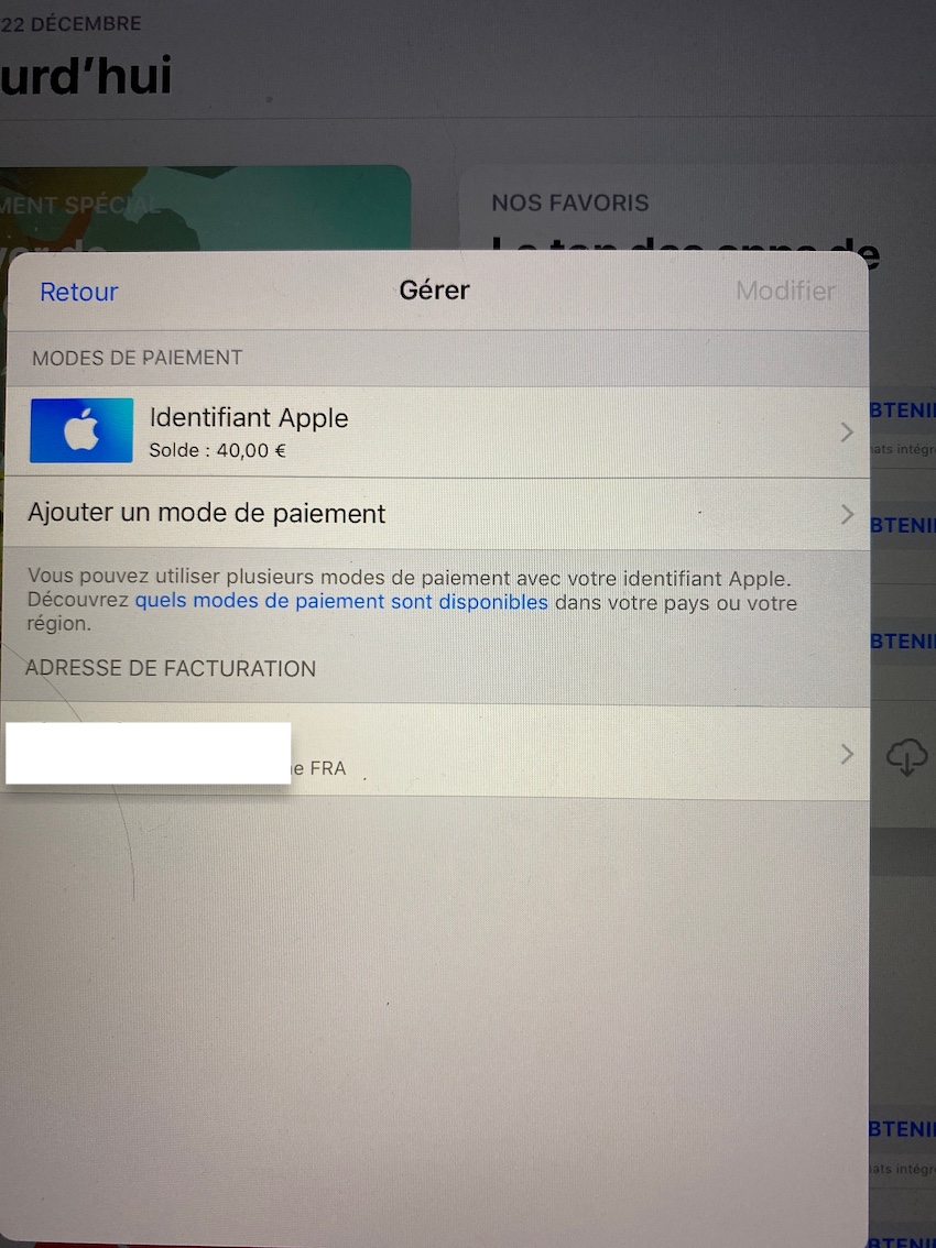 Je clique alors sur continuer mais ça me demande d’ajouter une carte alors que j’ai déjà ma carte de 40€ je clique donc sur retour et la ma carte apparaît.