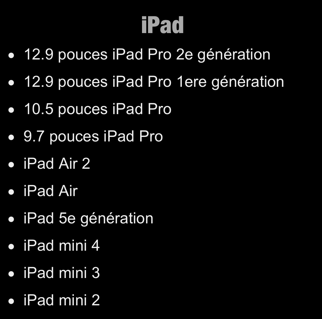 si votre modèle ne figure pas sur la liste, il y a une forte chance que le système de votre ipad ne supporte pas les versions plus récentes.