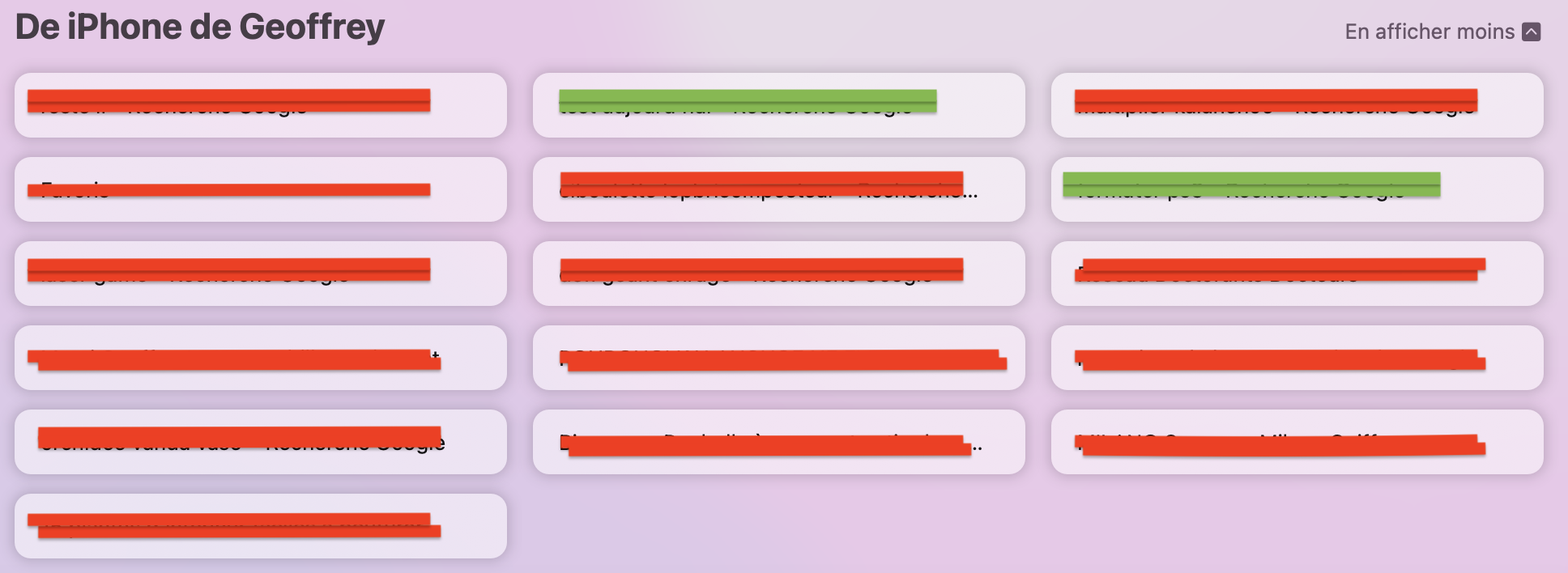 Depuis quelque temps, j'ai un ensemble d'onglets provenant de mon iPhone qui s'affiche sur la page de démarrage Safari de mon Mac et de mon iPad, que je ne parviens pas à retirer. Lorsque je supprime ces onglets, ils disparaissent mais réapparaissent dès que j'ouvre à nouveau Safari sur mon Mac ou mon iPad. Je précise qu'ils ne sont pas dans le Safari de mon iPhone : ce sont de vieux onglets que j'ai consultés il y a un moment déjà (plusieurs mois) et que j'ai fermés depuis. Pourtant, ils continuent d'apparaître sur le Safari de mon Mac et de mon iPad.
