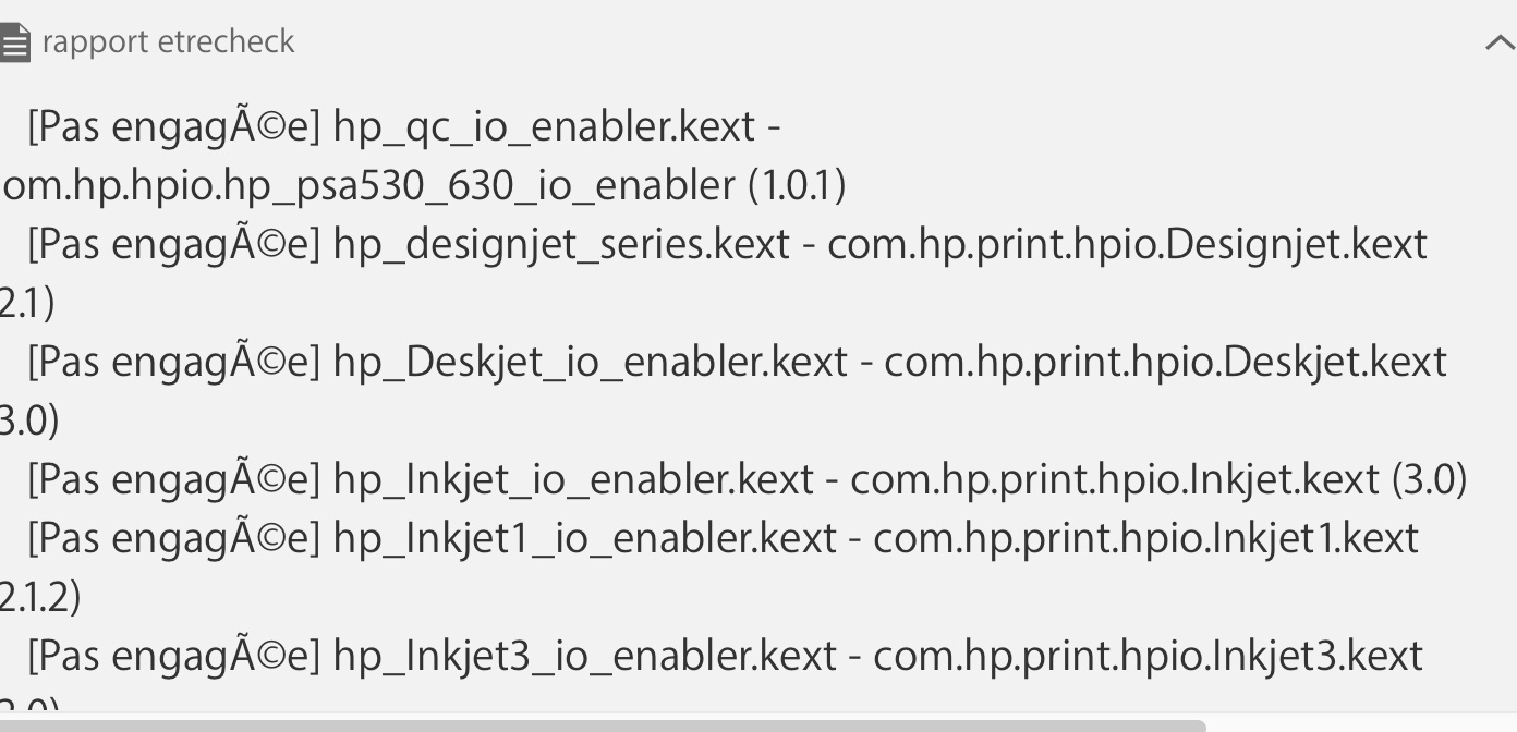 Après avoir lancé une vérification etrecheck et après avoir reçu le rapport, je voudrais savoir comment régler les différents problèmes (excepté la sauvegarde TimeMachine qui est évidente...)
