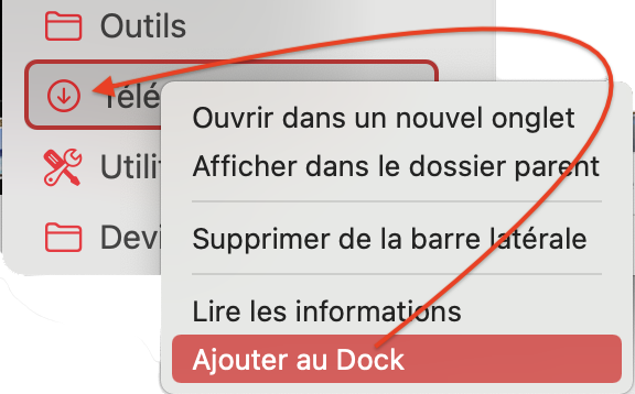 Sélectionne "Téléchargements" clic droit "Ajouter au Dock".