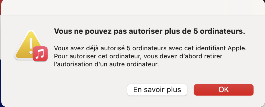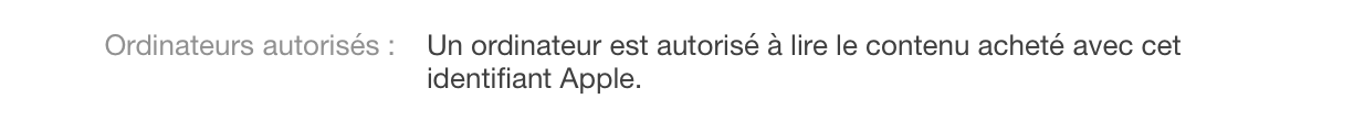J'ai récemment changé la carte mère de mon iMac. Depuis, je peux me connecter à mon compte iTunes, mais plus autoriser mon ordinateur à accéder au contenu acheté. Lorsque je veux autoriser cet ordinateur, j'ai un message me disant avoir atteint ma limite de 5 ordinateurs. J'ai retiré certains appareils, dont cet ordinateur avec son ancienne carte mère (qui apparaissait comme un ordinateur différent), pour ne plus avoir que 3 ordinateurs autorisés, mais ça ne change rien, je ne peux toujours pas autoriser celui ci.