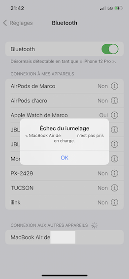 Je voulais juste activer mon bluethout et le mettr avec mon mac j’ai un iPhone 12 Pro et un MacBook Air 1 2021.