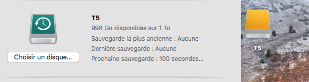 J'ai un disque dur externe Samsung T5 SSD . J'aimerais sauvegarder mon mac mais quand je lance la sauvegarde , j'ai le message "Time Machine n'a pas pu sauvegarder sur..." Détails "L’un des disques en cours de sauvegarde a peut-être été éjecté ou déconnecté de l’ordinateur."