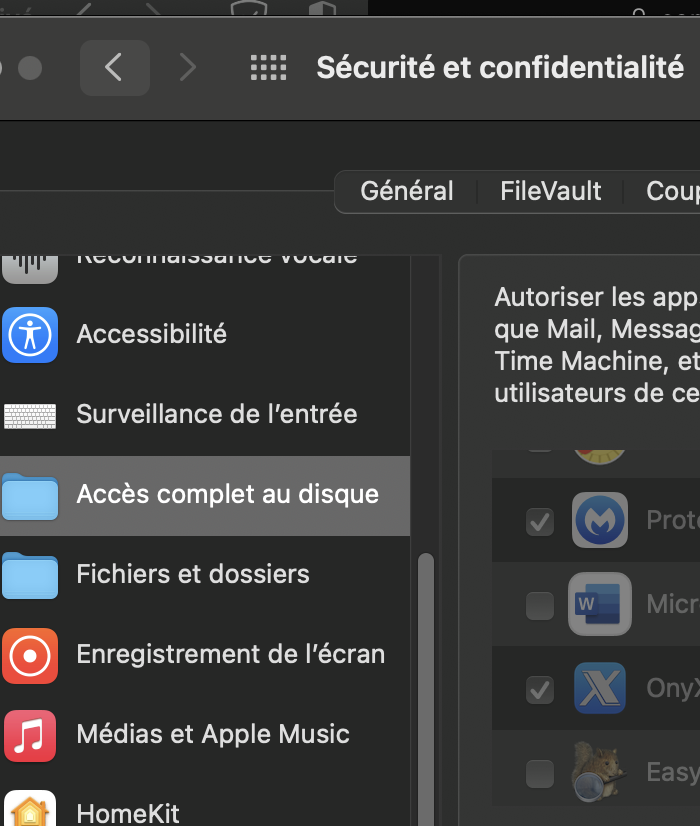 je suis sous Highsierra 10.13.6 et je n'ai pas dans les parametres système les onglets Accès complet au disque,