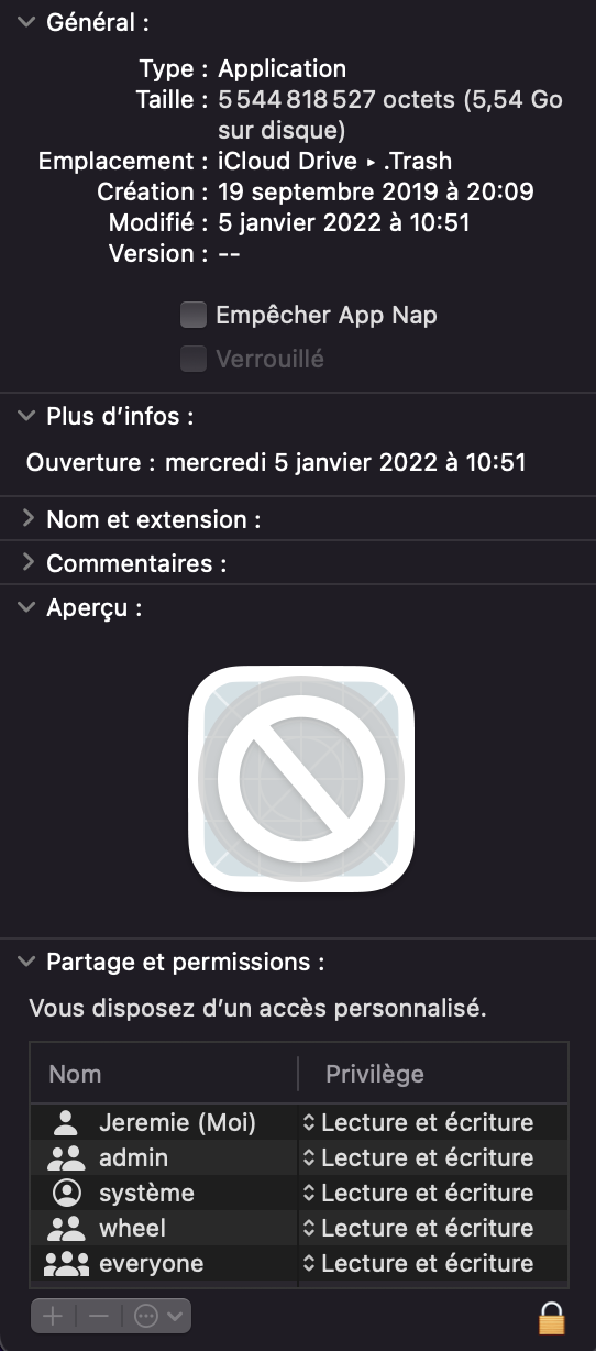 j'ai un souci sur Monterey, j'ai un fichier bloqué dans la corbeille. J'ai le message "Impossible d’effectuer l’opération car l’élément « XXXXX » est utilisé."