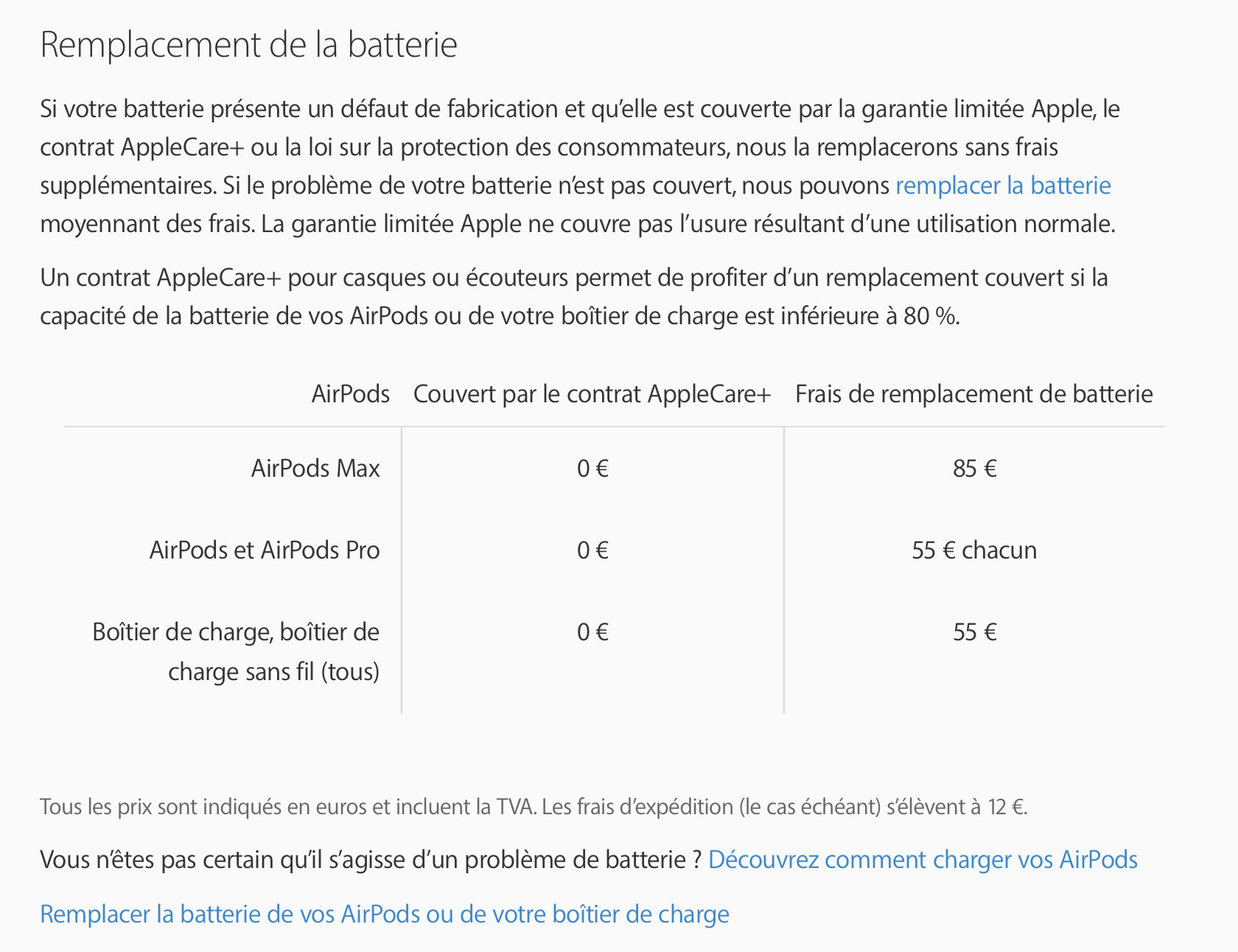 Voici ce que j'ai trouvé concernant la batterie des AirPods en faisant un tour sur la page : Service après-vente, remplacement et réparation des AirPods.
