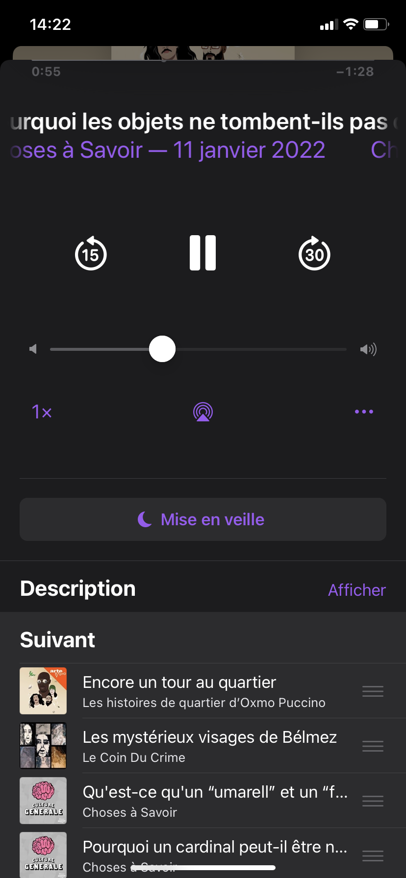 Lorsque tu écoutes un Podcast, fais glisser ton doigt du bas vers le haut. Tu devrais voir ta liste d'attente :