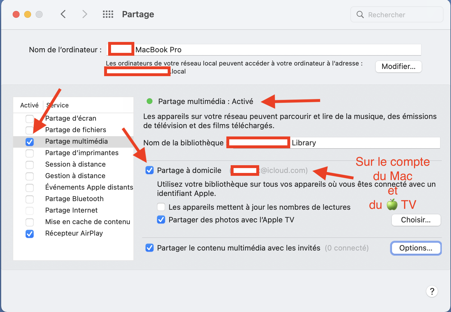 Après tests et vérifications, je récupère bien mes vidéos personnelles de TV du MacBook sur l'Apple TV. Quand mon Mac est ouvert sur mon profil ( qui est celui de l'Apple TV) dans la rubrique Bibliothèque de ..... , entre Musiques et Photos , il a "Vidéos Personnelles " ( qui sont bien celles de l'Apple TV du Mac et elles sont toutes là!) CQFD !