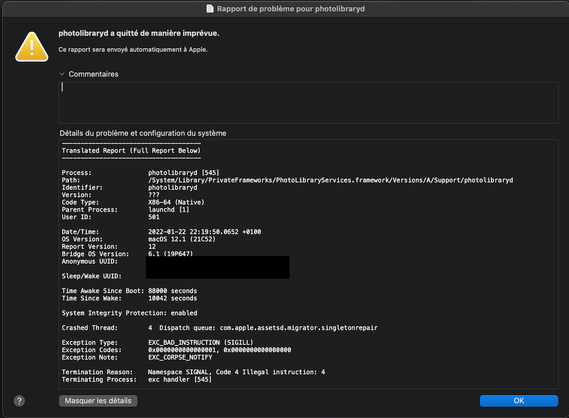 Qd je lance Photos (depuis mon MBA), j'ai un plantage de l'application, et impossible de synchroniser mes photos qui sont pourtant bien sur photos iCloud.