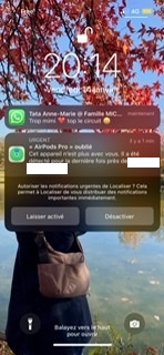 J’ai téléphone l’assistance Apple 2 fois, et lors de mes deux appels, les conseillers m’ont demandé de faire plusieurs manipulations pour réinitialiser mes AirPods Pro, pour désactiver la géolocalisation puis la réactiver… j’ai même réinitialiser l’iPhone ! Mais rien n’y fait, je reçois toujours ces notifications qui sont un peu effrayantes (un jour je vais vraiment finir par les perdre…). Petit détail étrange que j’ai constaté : les notifications étaient en français (ce qui est normal jusque là), mais depuis 5 jours, ces notifications arrivent en Anglais mélangé avec du français
