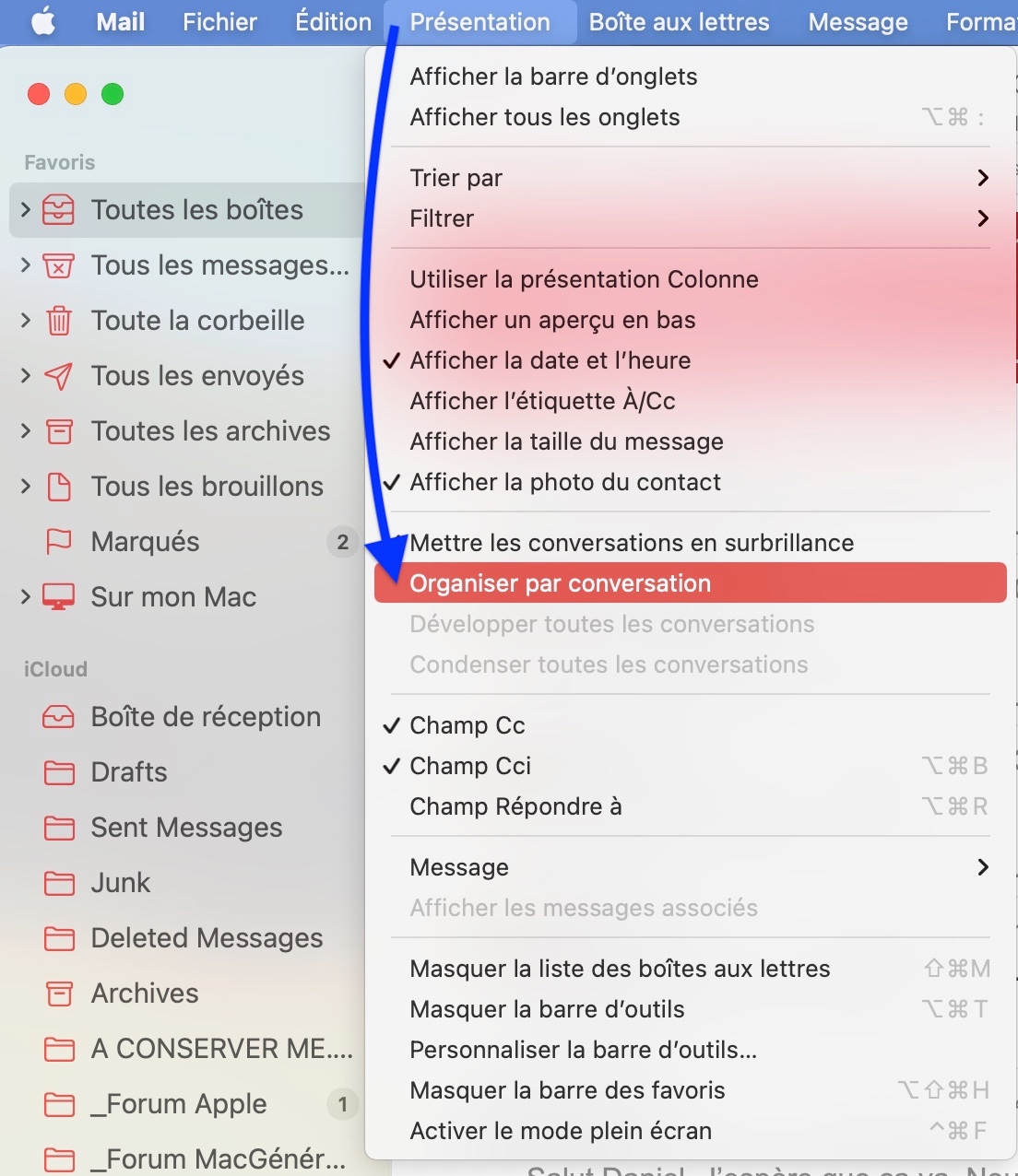 L'appli organise les mails par conversation ce que je ne souhaite pas. Je décoche systématiquement et pour chaque dossier "organiser par conversation" dans "présentation". Qu'à la limite il me colorie les messages liés les uns aux autres je trouve ça super mais qu'il les organise par défaut par conversation me gêne beaucoup. Je ne vois pas de généralité dans "préférence" de "mail". Quelqu'un aurait une astuce ?