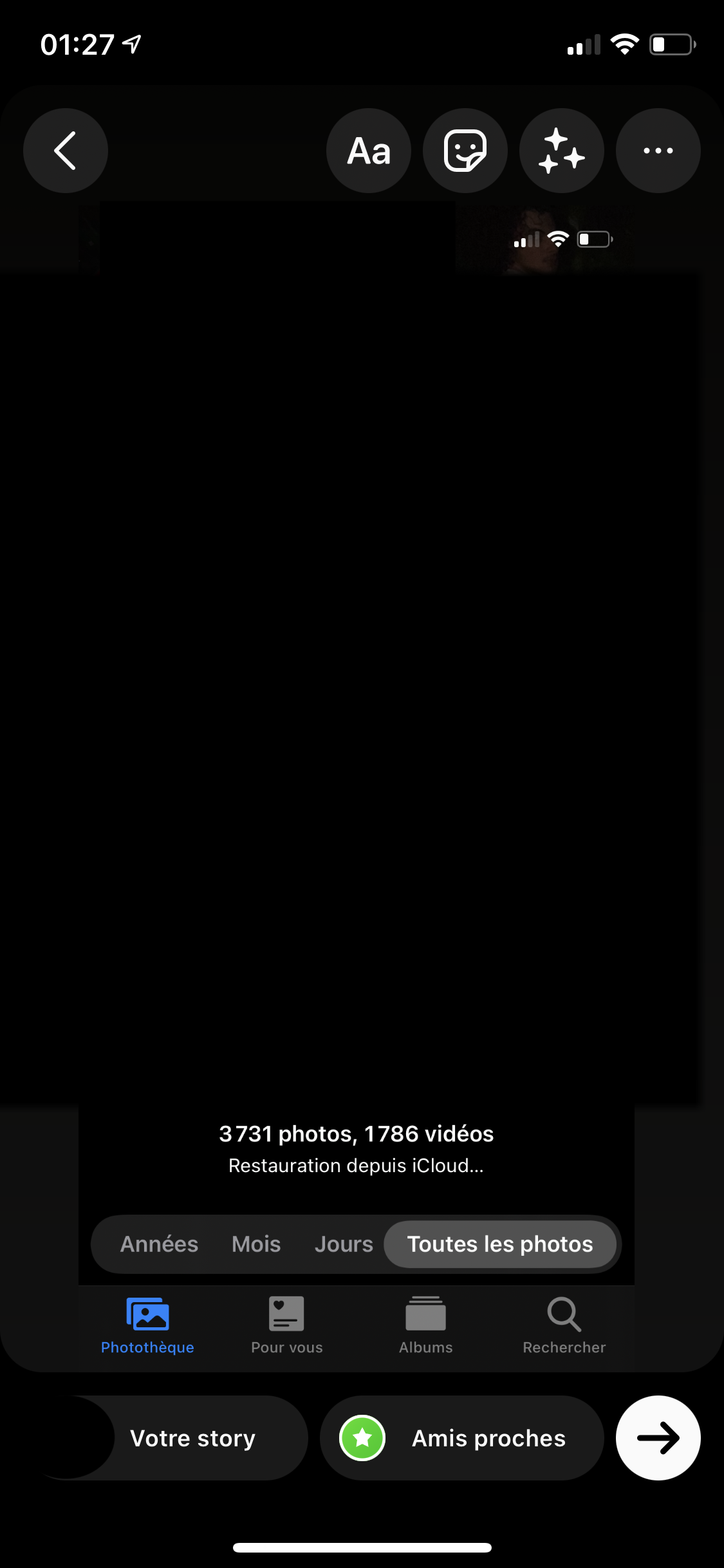 Je t'invite à aller dans l'app Photos de ton iPhone, à cliquer sur l'onglet Photothèque et à descendre tout en bas de la page jusqu'à la partie où est indiqué le nombre de photos et de vidéos présentes sur ton iPhone. Tu devrais avoir une barre de progression concernant l'état de la synchronisation de tes photos avec iCloud. Regarde si celle-ci s'est mise en pause, si c'est le cas connecte ton iPhone au Wi-Fi et branche-le sur secteur, puis relance la synchronisation.