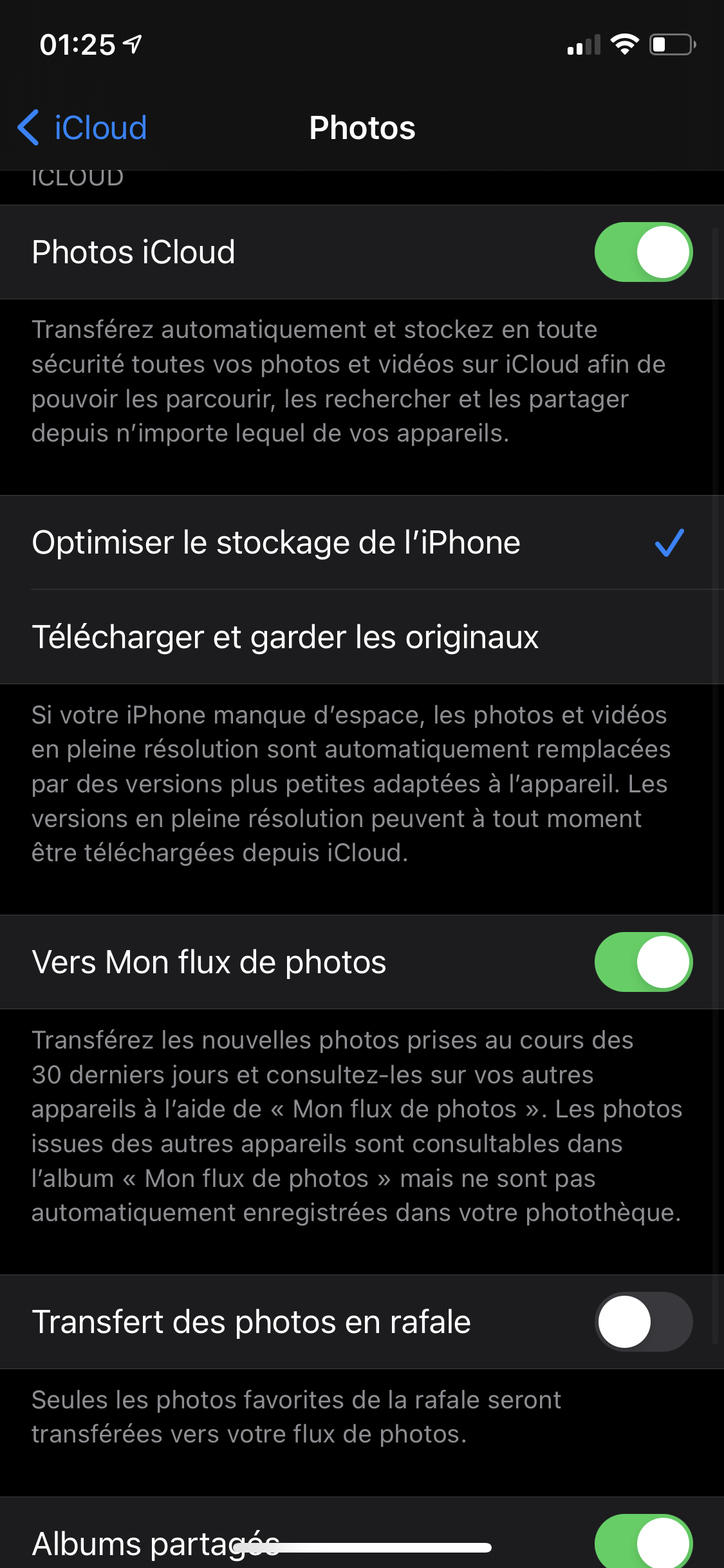 Pour commencer, peux-tu aller dans Réglages > ton nom > iCloud > Photos et nous envoyer une capture d'écran de ces réglages sans aucune donnée personnelle ? Envoie-nous aussi une capture d'écran de la page Réglages > ton nom > iCloud > Gérer le stockage, là encore sans donnée personnelle.