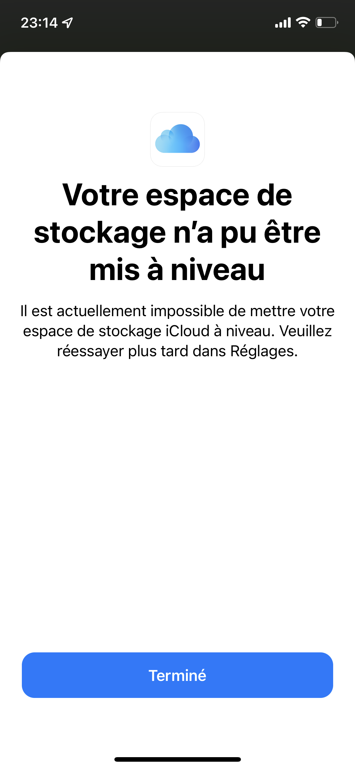 Je vous invite à redemarrer votre iPhone puis réessayer. Vous pouvez aussi utiliser d'autres méthodes pour augmenter votre stockage iCloud, elles sont détaillée içi : https://support.apple.com/fr-fr/HT201318