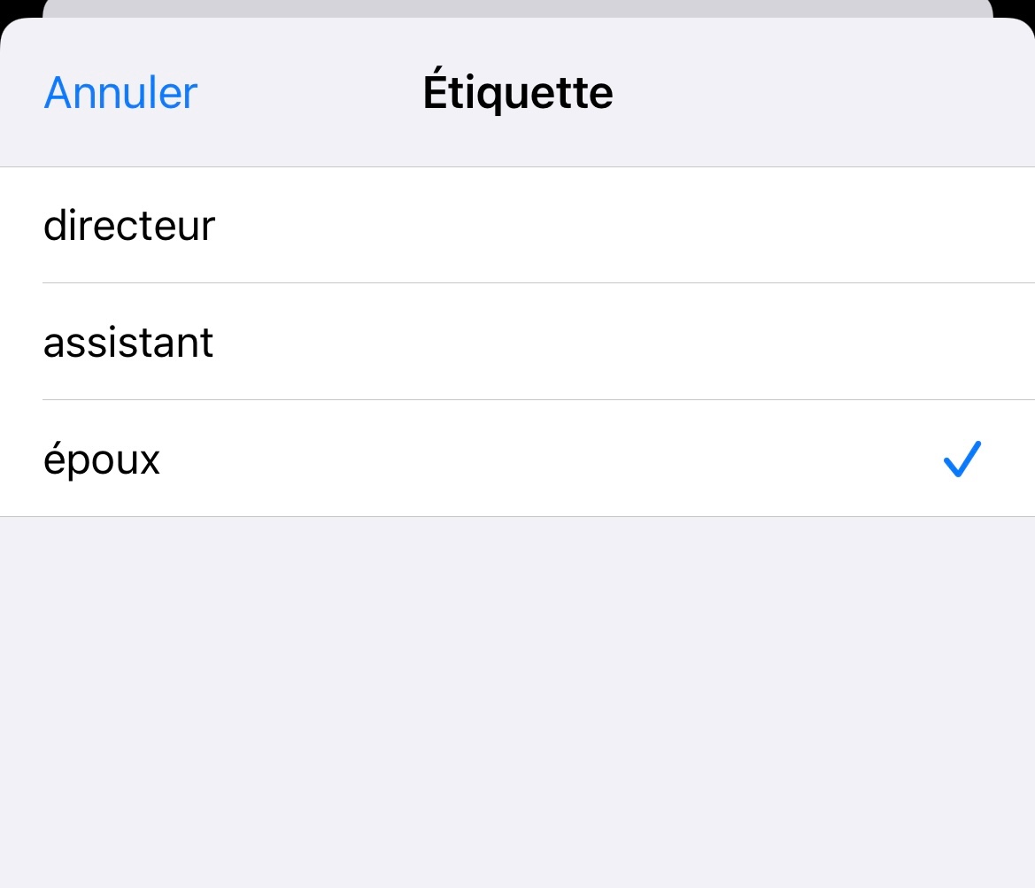 A partir de ma fiche de contact, pour les contacts déjà associés, je peux modifier l'attribution d'un contact associé et là mon iPhone me propose toutes sorte d'attribution dont directeur/assistant/époux.